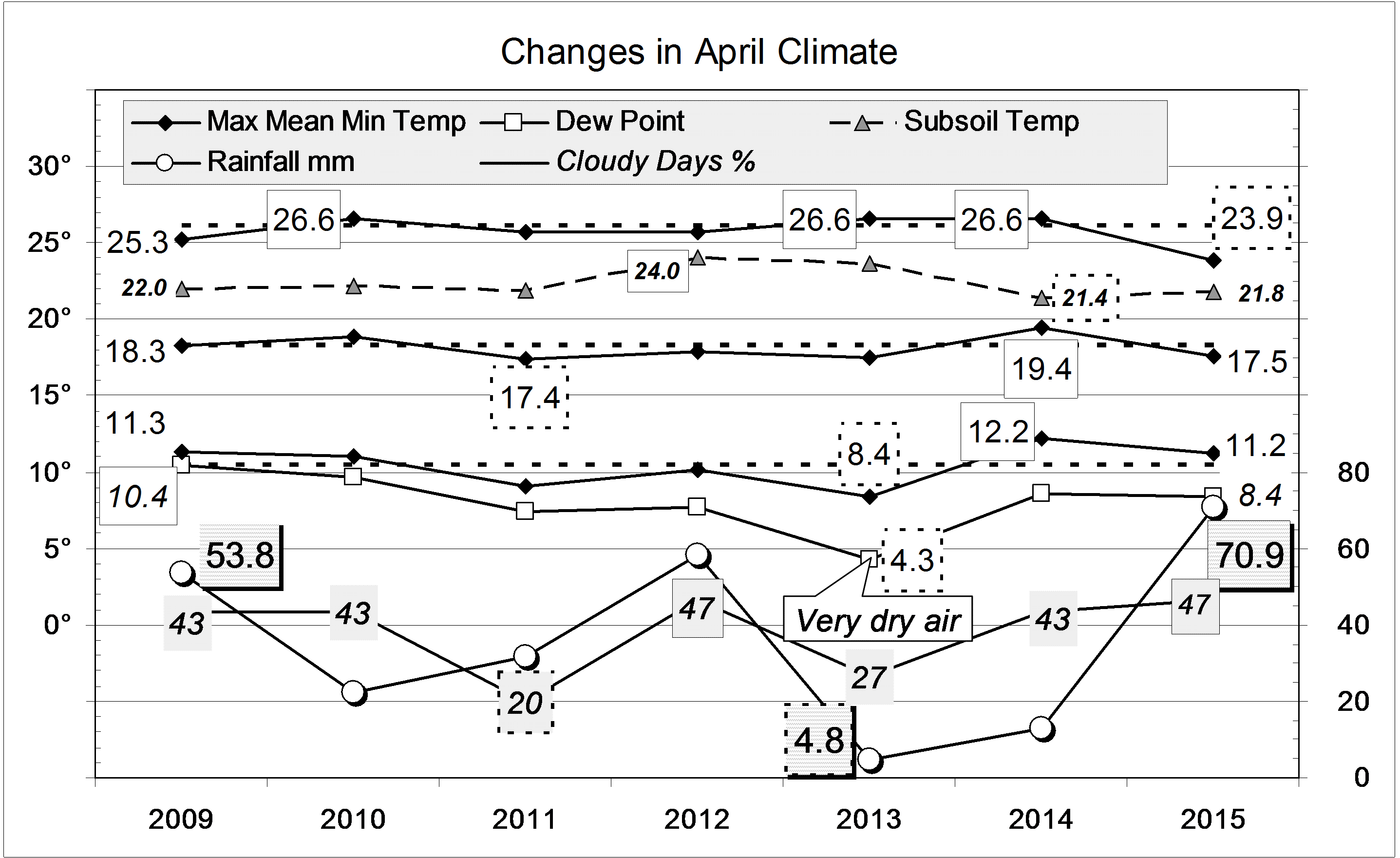 Published May 2, 2015 at 2874 × 1761 in Cool cloudy days in April 2015 « Previous Graphical log of the last seven April months at Manilla, NSW, showing mean values of maximum, minimum and mean temperature, soil temperature, early morning dew point and cloudy days percent, and total monthly rainfall in millimetres.