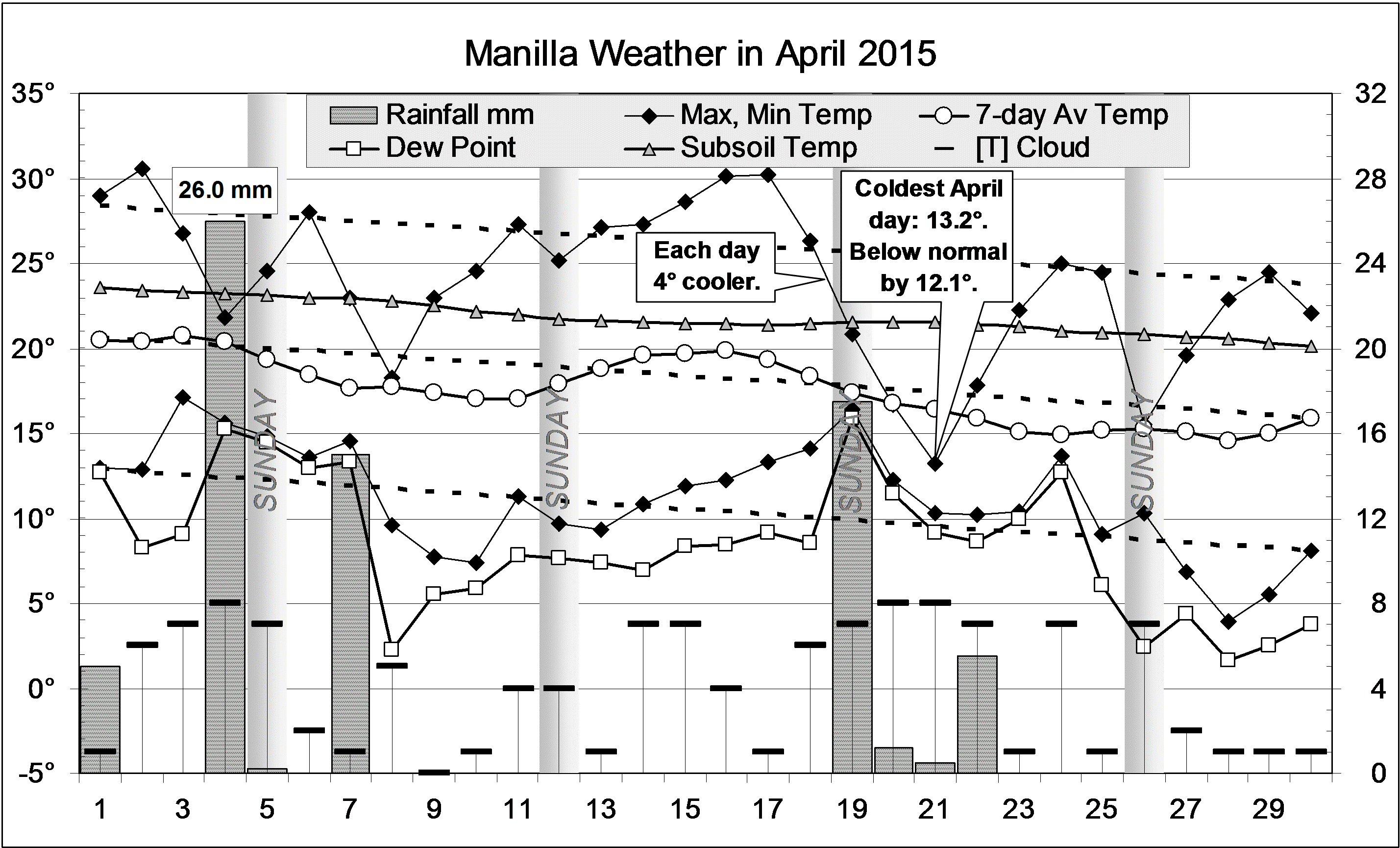Published May 2, 2015 at 2857 × 1730 in Cool cloudy days in April 2015 « Previous Next » Graphical log, for April 2015, of daily values of maximum and minimum temperatures, subsoil (750mm) temperature and early morning dew point (all in degrees Celsius), rainfall (mm) and cloud amount (octas). Weekly mean temperature also shown.
