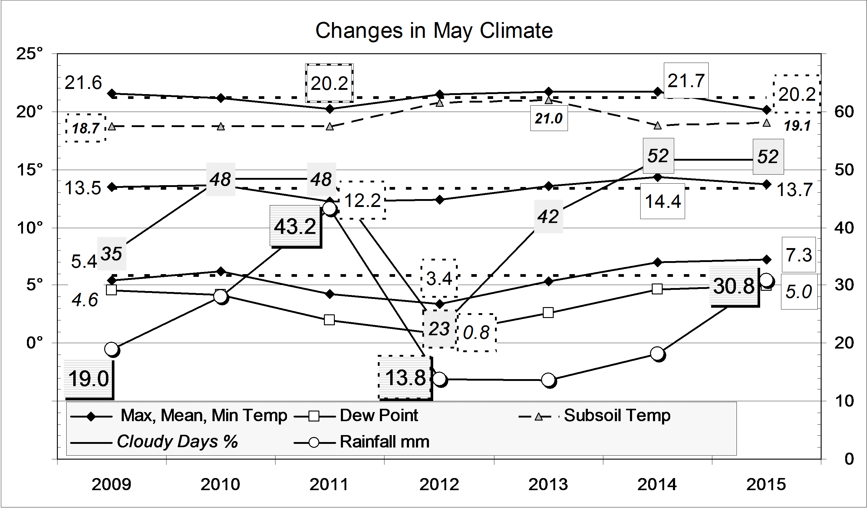 Published June 1, 2015 at 2864 × 1679 in Very cloudy days in May 2015 « Previous Graphical log of the last seven May months at Manilla, NSW, showing mean values of maximum, minimum and mean temperature, soil temperature, early morning dew point and cloudy days percent, and total monthly rainfall in millimetres.