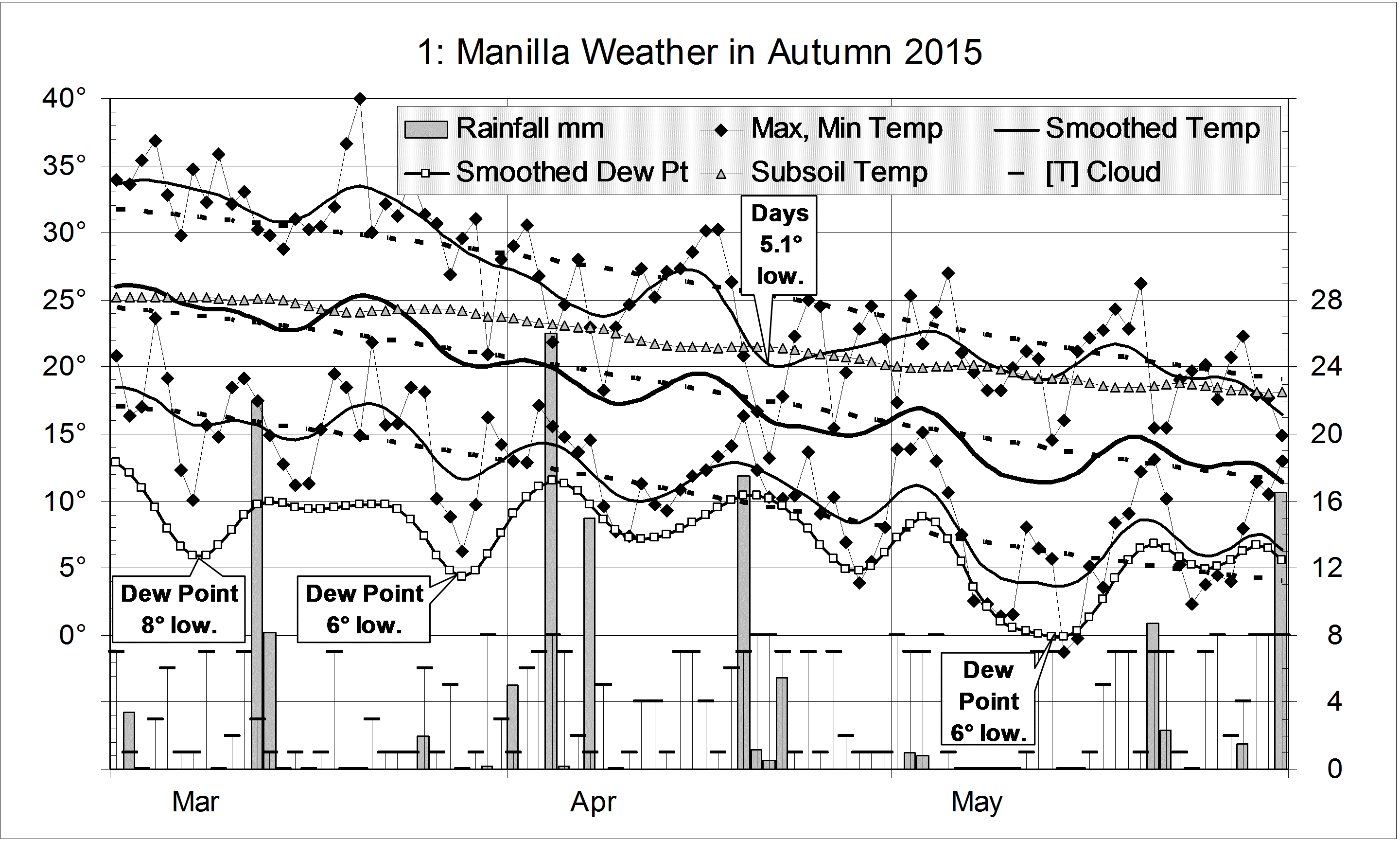 Graphical log, for autumn (MAM) of 2015 of daily values of maximum, minimum and mean temperatures, subsoil (750mm) temperature (all in degrees Celsius), rainfall (mm) and cloud amount (octas). Smoothed values of temperature and early morning dew point use a Gaussian smoothing function with half-width 6 days.