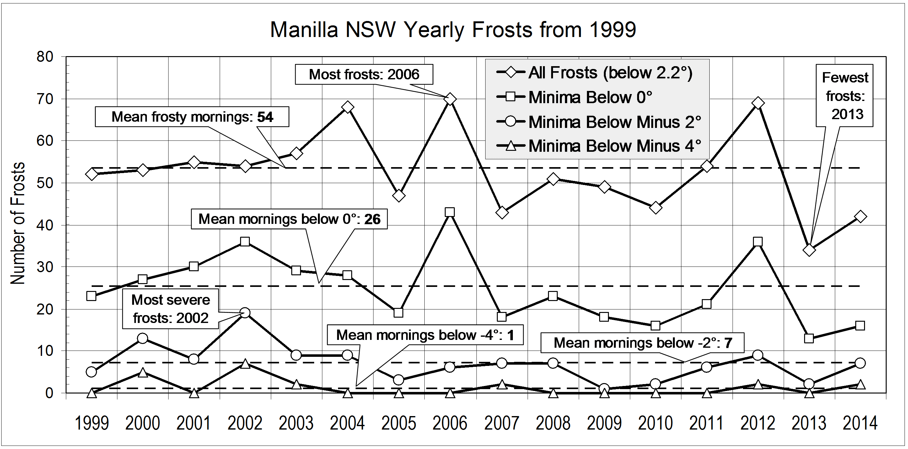 Published June 6, 2015 at 2893 × 1432 in Manilla’s Frosts to 2014 Next » Graphical log of the number of frosts at Manilla in the years from 1999 to 2014. There are separate logs for frosts below plus 2.2 degrees in the screen, below zero, below minus two degrees and below minus four degrees.