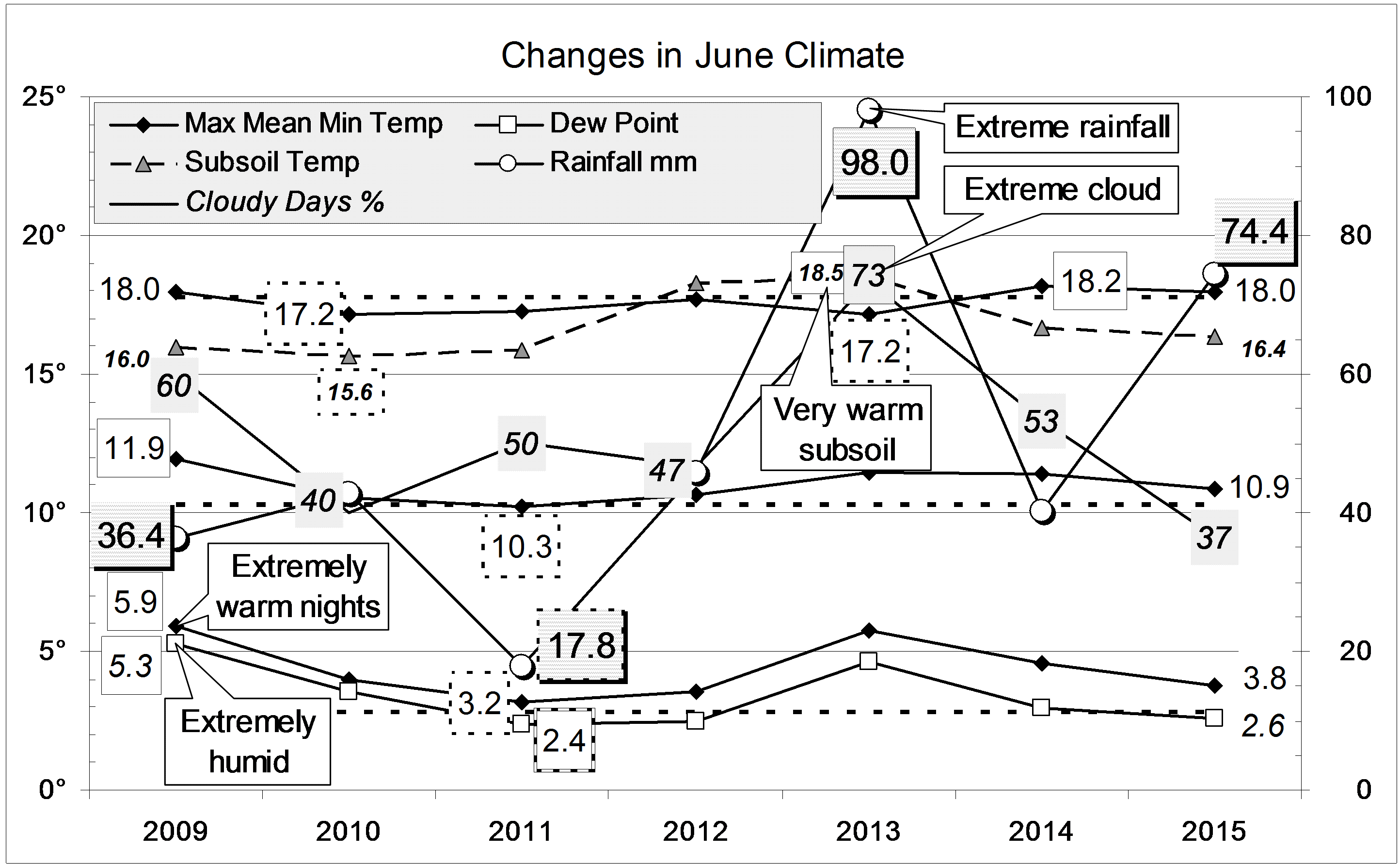 Published July 3, 2015 at 2888 × 1785 in June 2015 rather wet « Previous Graphical log of the last seven June months at Manilla, NSW, showing mean values of maximum, minimum and mean temperature, soil temperature, early morning dew point and cloudy days percent, and total monthly rainfall in millimetres.
