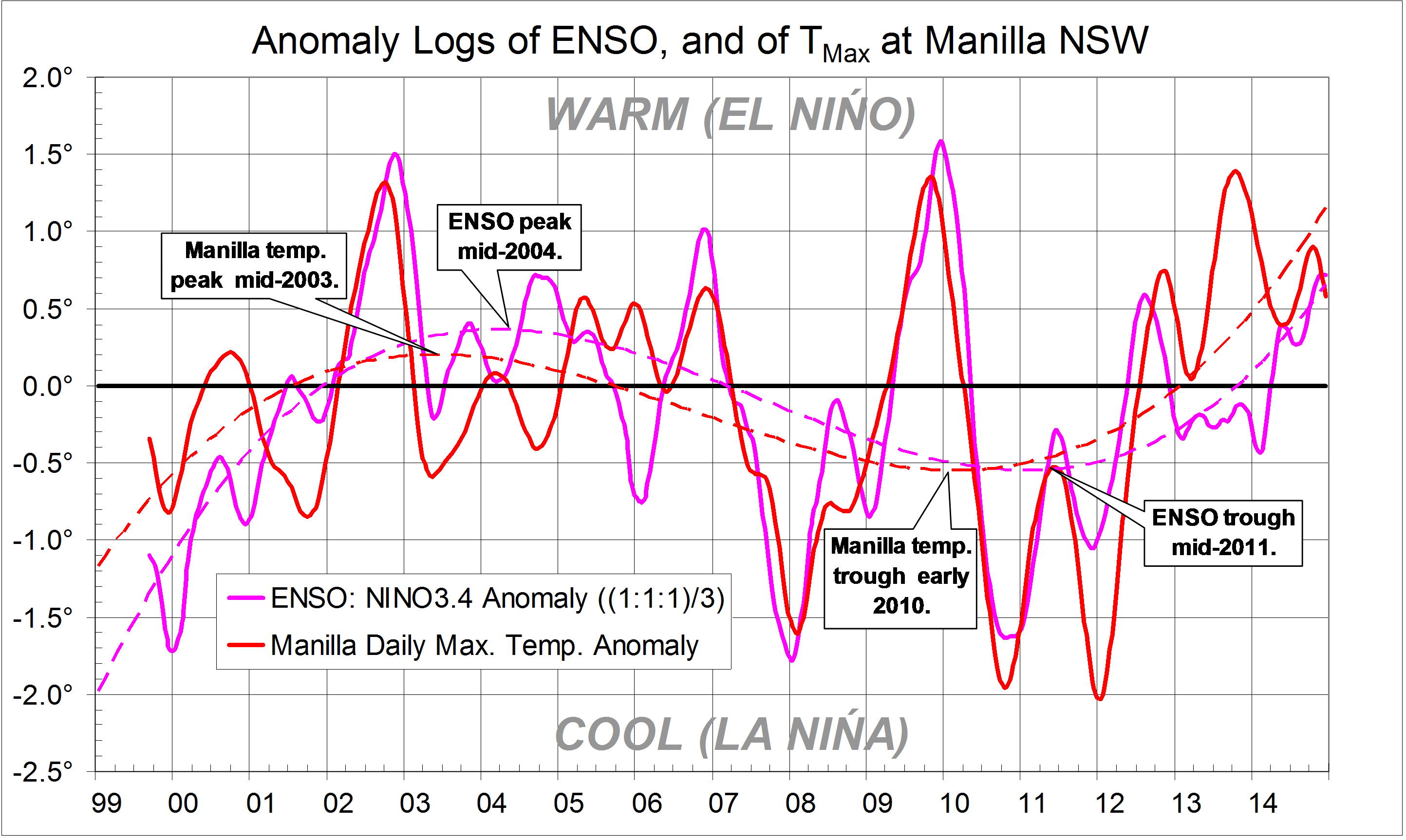 Published July 8, 2015 at 2887 × 1725 in El Niño and My Climate Next » Graphical logs for the last sixteen years of ENSO and smoothed maximum temperature at Manilla, NSW.