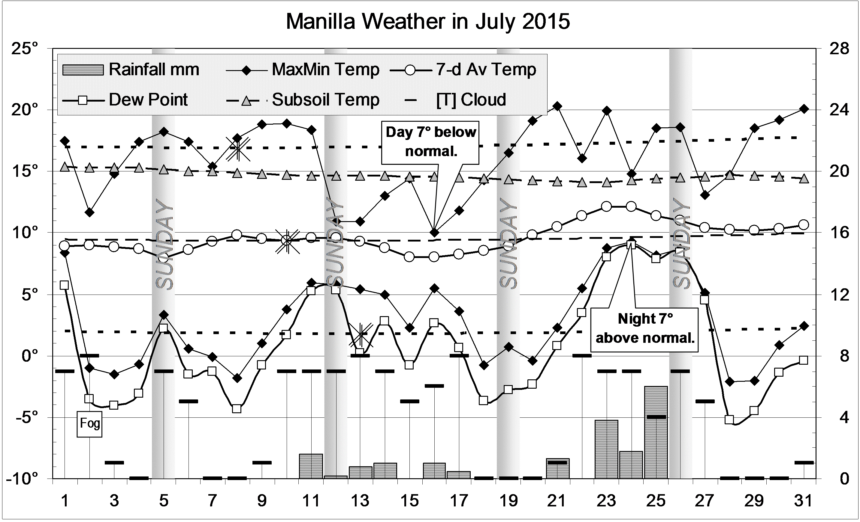 Published August 2, 2015 at 2865 × 1742 in July 2015 cloudy and cool « Previous Next » Graphical log, for July 2015, of daily values of maximum and minimum temperatures, subsoil (750mm) temperature and early morning dew point (all in degrees Celsius), rainfall (mm) and cloud amount (octas). Weekly mean temperature also shown.