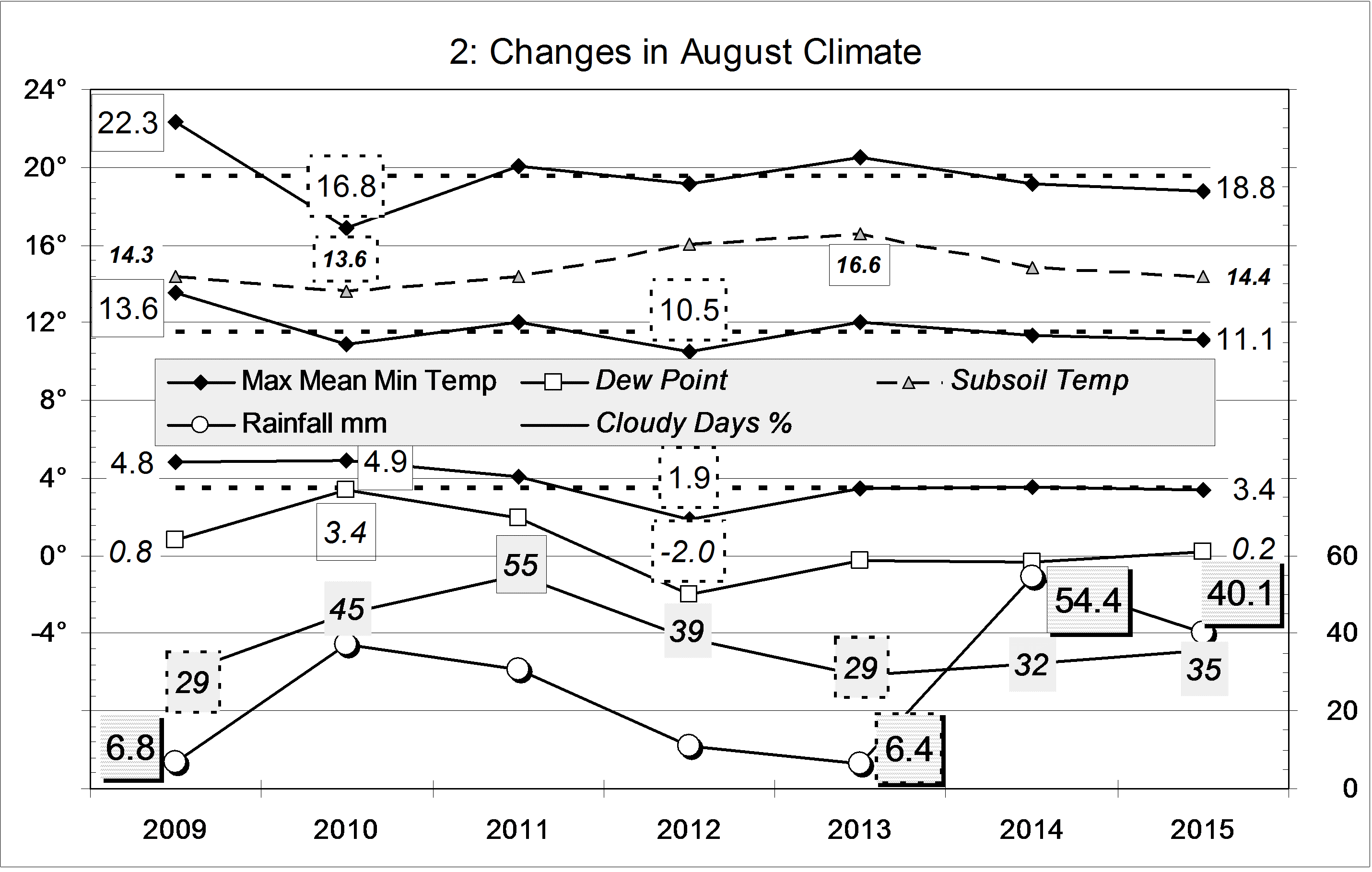 Published September 1, 2015 at 2861 × 1818 in August 2015 normal weather « Previous Graphical log of the last seven August months at Manilla, NSW, showing mean values of maximum, minimum and mean temperature, soil temperature, early morning dew point and cloudy days percent, and total monthly rainfall in millimetres.
