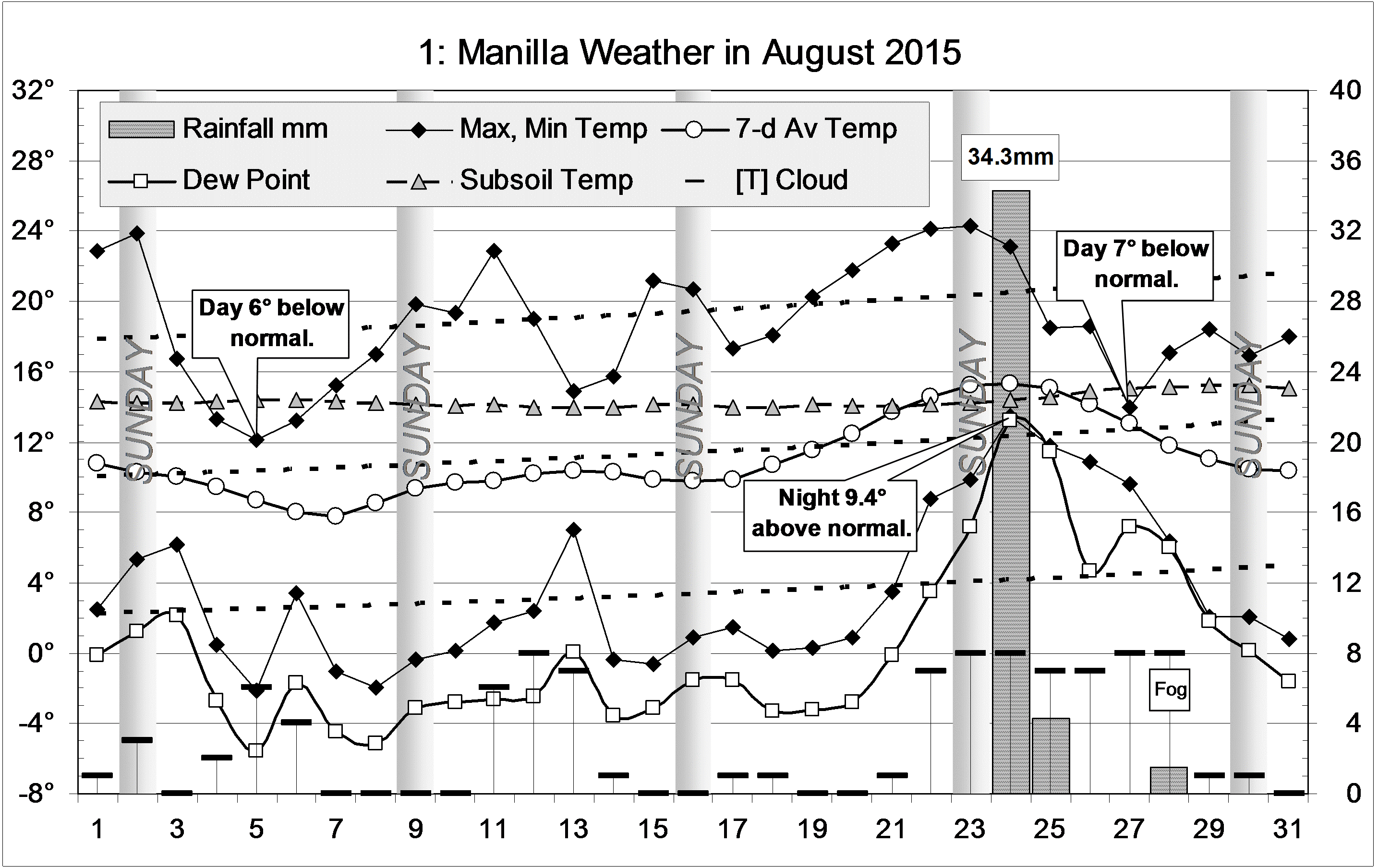 Published September 1, 2015 at 2870 × 1808 in August 2015 normal weather « Previous Next » Graphical log, for August 2015, of daily values of maximum and minimum temperatures, subsoil (750mm) temperature and early morning dew point (all in degrees Celsius), rainfall (mm) and cloud amount (octas). Weekly mean temperature also shown.