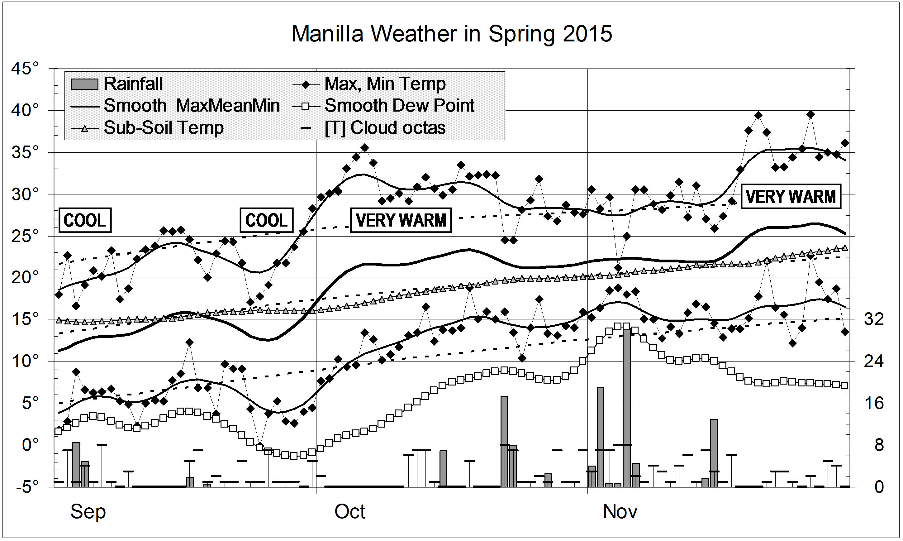 Graphical log, for spring (SON)) of daily values of maximum, minimum and mean temperatures, subsoil (750mm) temperature (all in degrees Celsius), rainfall (mm) and cloud amount (octas). Smoothed values of temperature and early morning dew point use a Gaussian smoothing function with half-width 6 days.