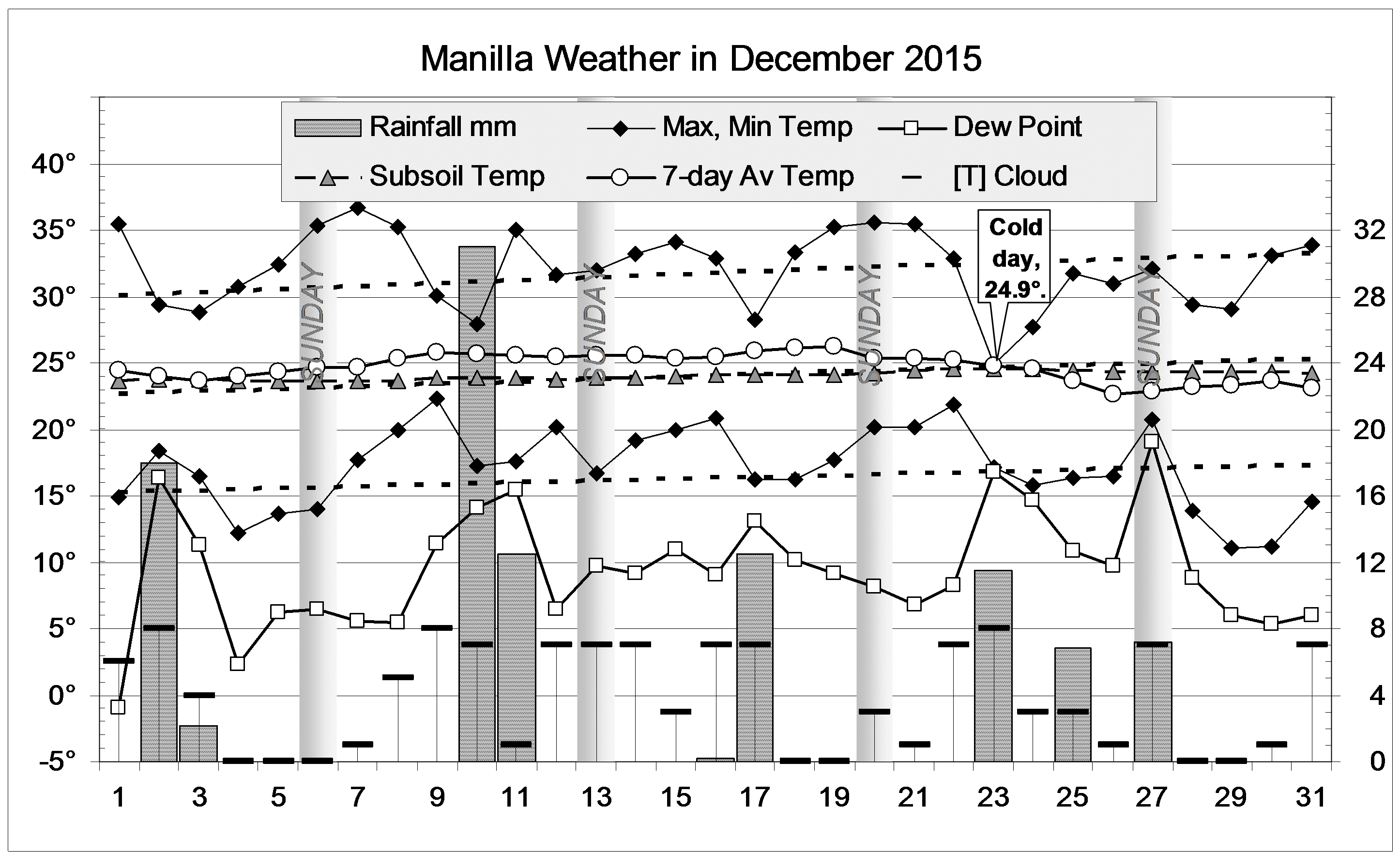 Published January 3, 2016 at 2892 × 1764 in December 2015: normal month, normal year « Previous Next » Graphical log, for December 2015, of daily values of maximum and minimum temperatures, subsoil (750mm) temperature and early morning dew point (all in degrees Celsius), rainfall (mm) and cloud amount (octas). Weekly mean temperature also shown.