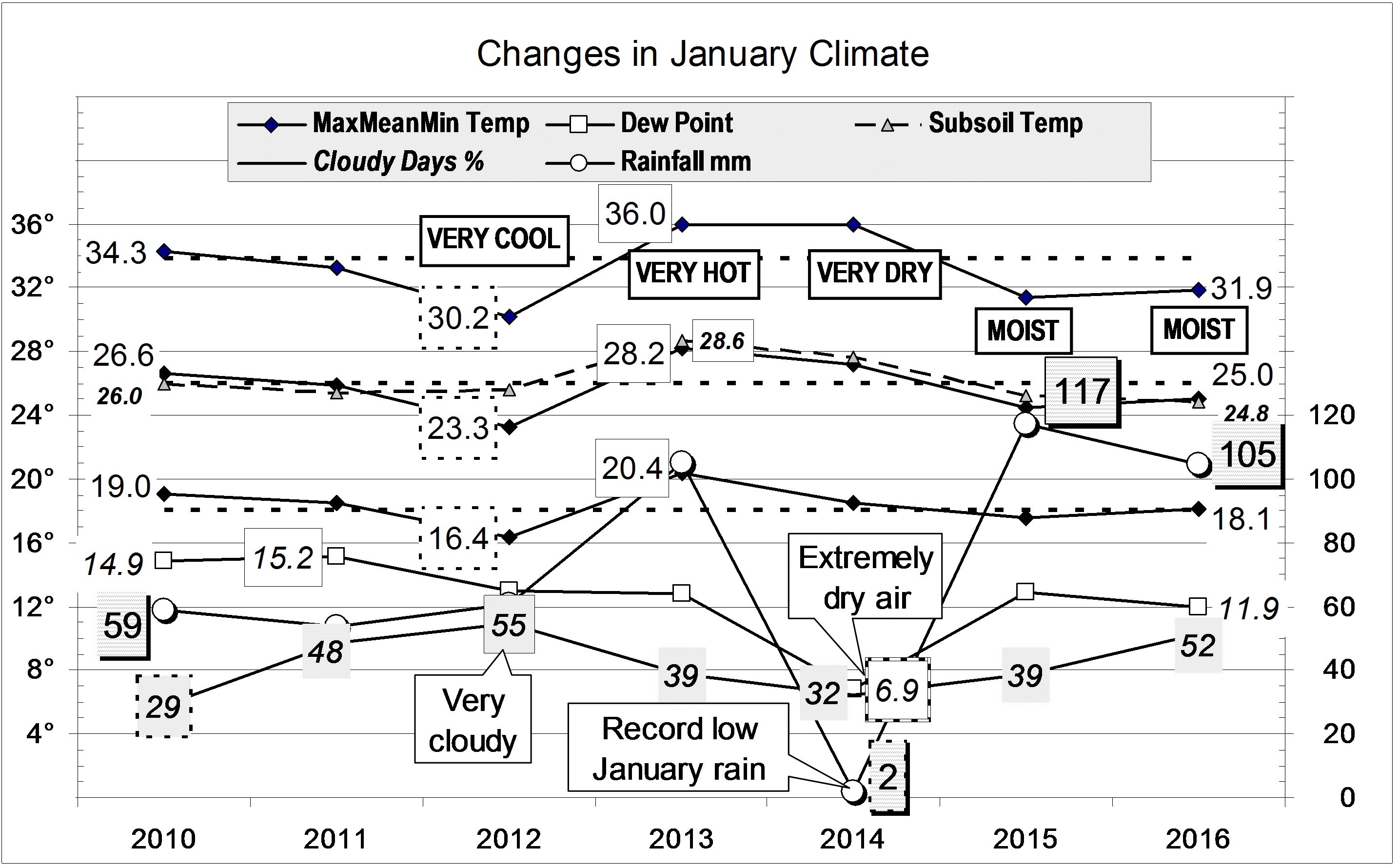 Published February 1, 2016 at 2869 × 1780 in January 2016: moist again « Previous Graphical log of the last seven January months at Manilla, NSW, showing mean values of maximum, minimum and mean temperature, soil temperature, early morning dew point and cloudy days percent, and total monthly rainfall in millimetres.