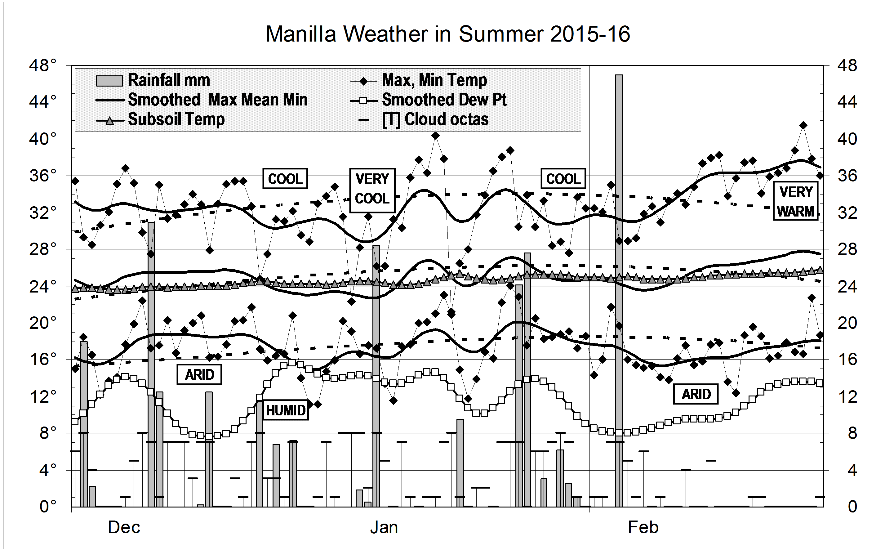 Graphical log, for summer (DJF)) of daily values of maximum, minimum and mean temperatures, subsoil (750mm) temperature (all in degrees Celsius), rainfall (mm) and cloud amount (octas). Smoothed values of temperature and early morning dew point use a Gaussian smoothing function with half-width 6 days.