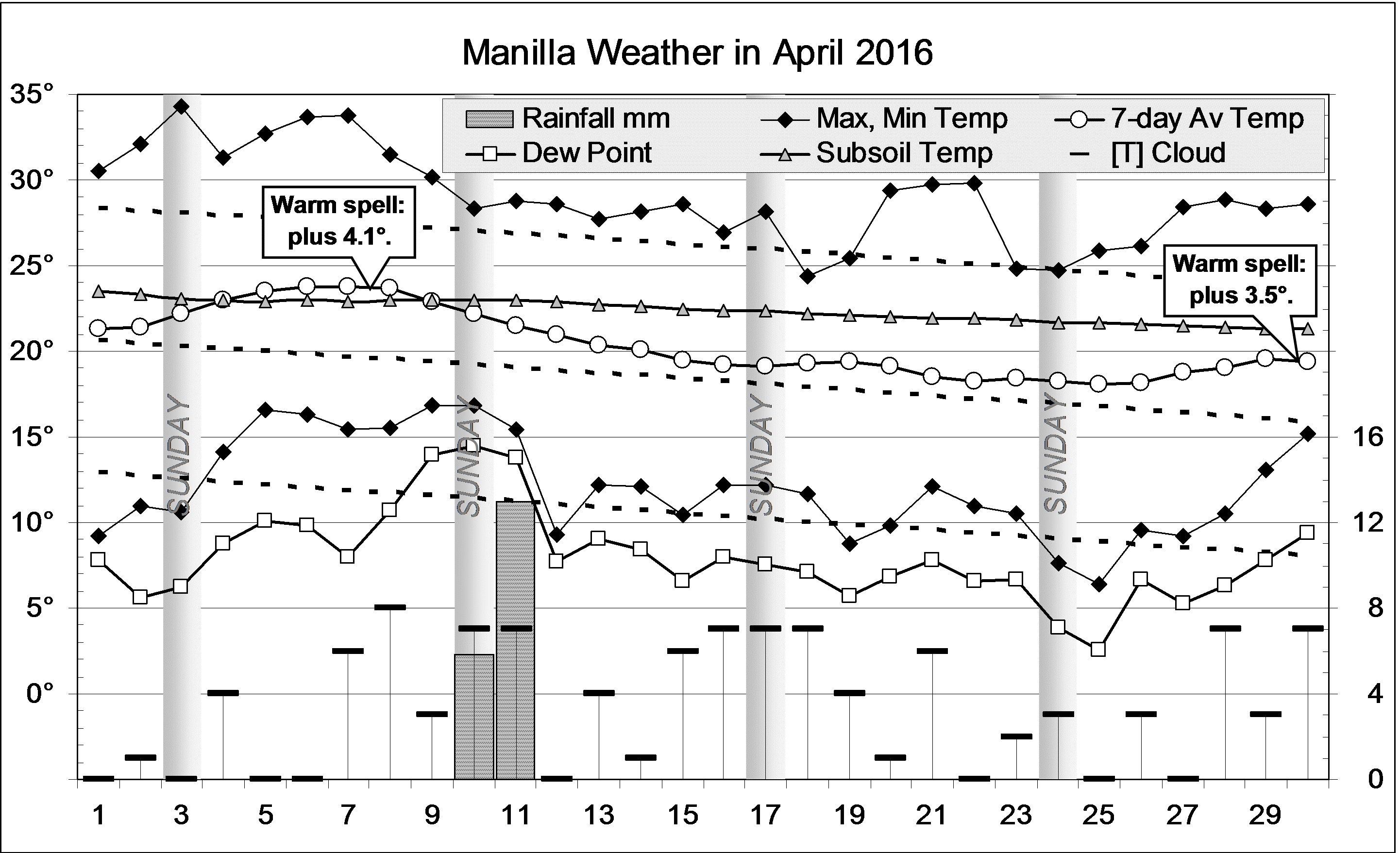 Published May 1, 2016 at 2883 × 1757 in April 2016 also warm « Previous Next » Graphical log, for April 2016, of daily values of maximum and minimum temperatures, subsoil (750mm) temperature and early morning dew point (all in degrees Celsius), rainfall (mm) and cloud amount (octas). Weekly mean temperature also shown.
