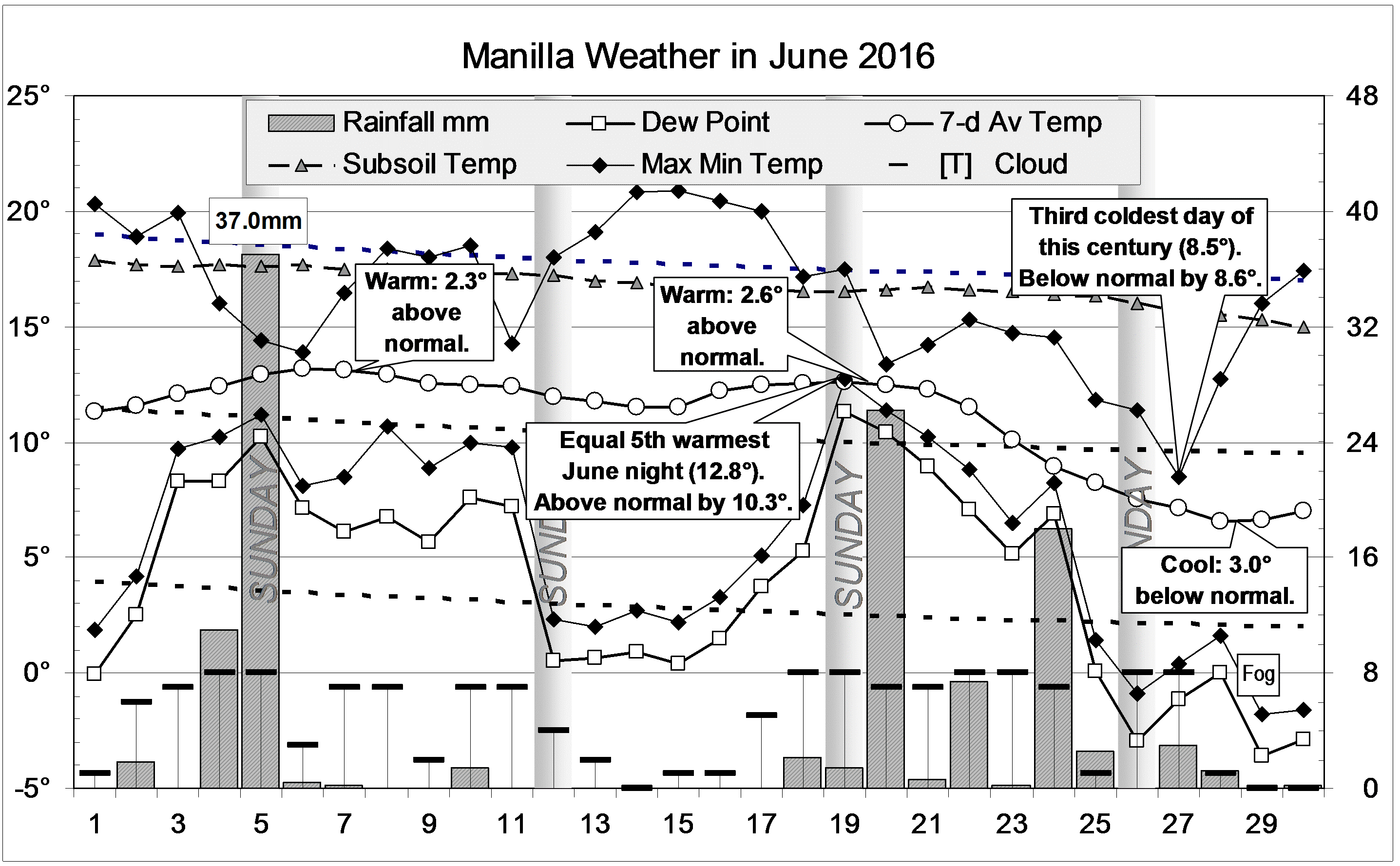 Published July 2, 2016 at 2873 × 1778 in June 2016: extreme rain Next » Graphical log, for June 2016, of daily values of maximum and minimum temperatures, subsoil (750mm) temperature and early morning dew point (all in degrees Celsius), rainfall (mm) and cloud amount (octas). Weekly mean temperature also shown.