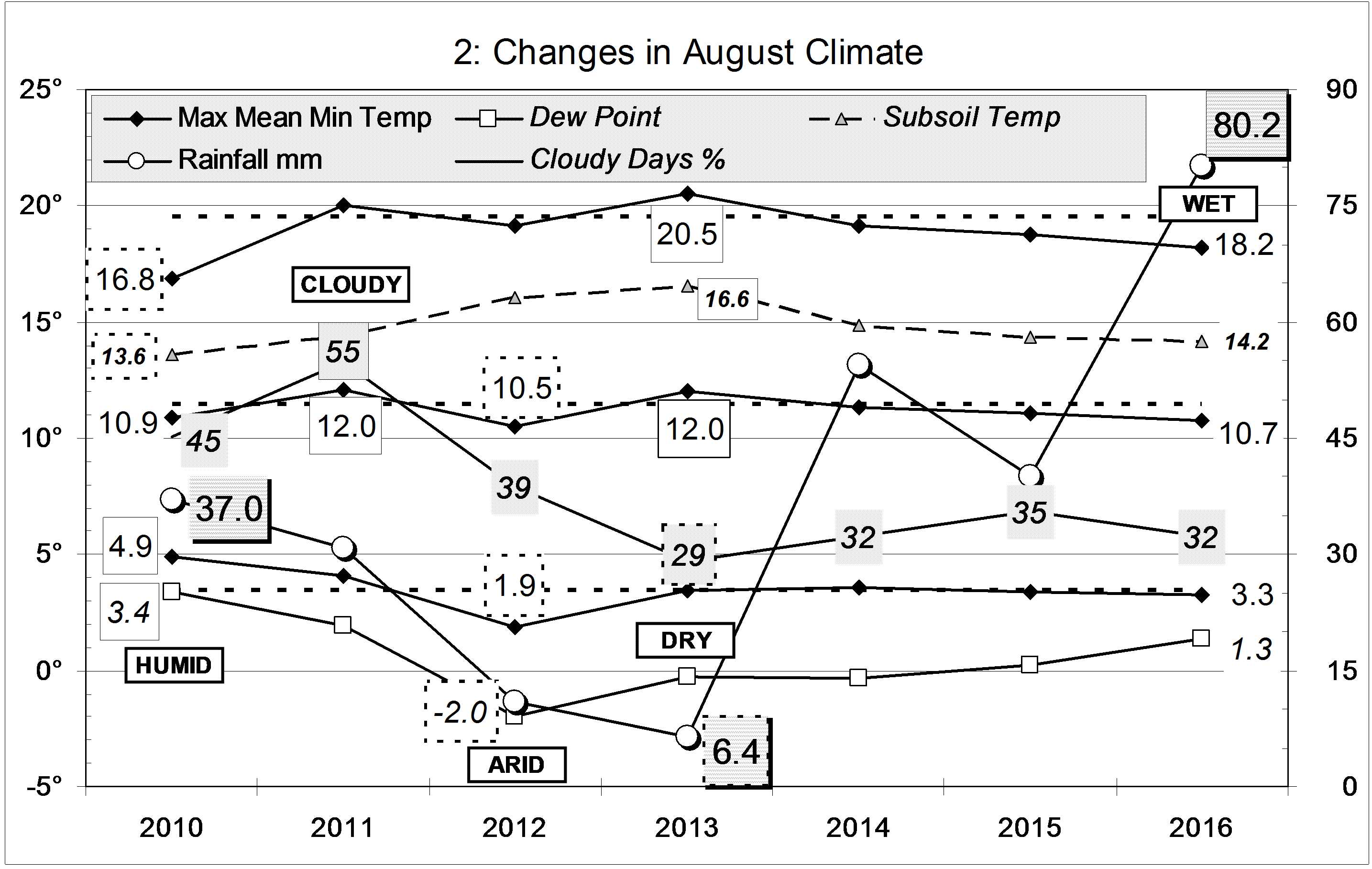 Published September 1, 2016 at 2869 × 1817 in Wet August 2016 had two cold days « Previous Graphical log of the last seven August months at Manilla, NSW, showing mean values of maximum, minimum and mean temperature, soil temperature, early morning dew point and cloudy days percent, and total monthly rainfall in millimetres.