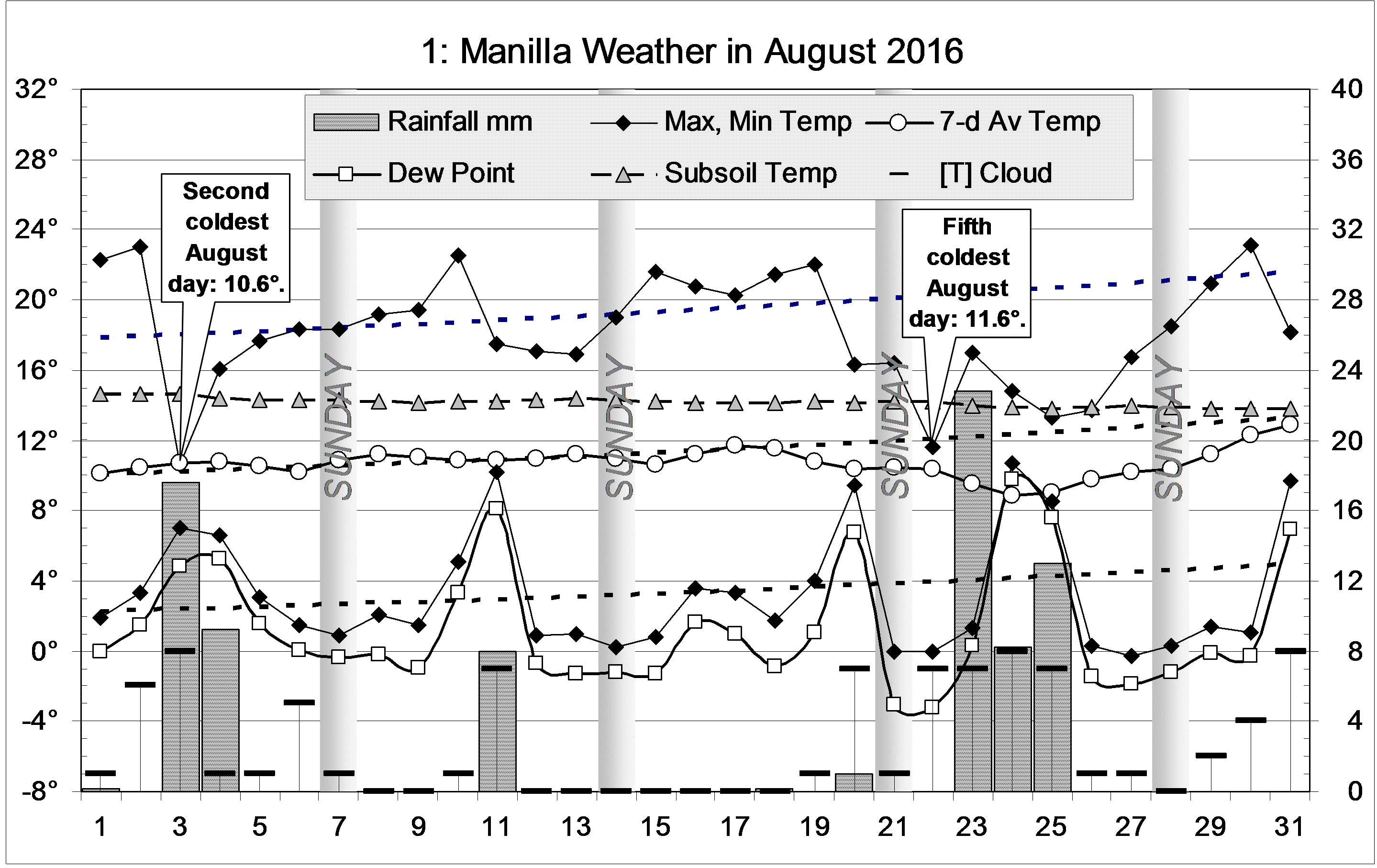 Published September 1, 2016 at 2878 × 1814 in Wet August 2016 had two cold days « Previous Next » Graphical log, for August 2016, of daily values of maximum and minimum temperatures, subsoil (750mm) temperature and early morning dew point (all in degrees Celsius), rainfall (mm) and cloud amount (octas). Weekly mean temperature also shown.