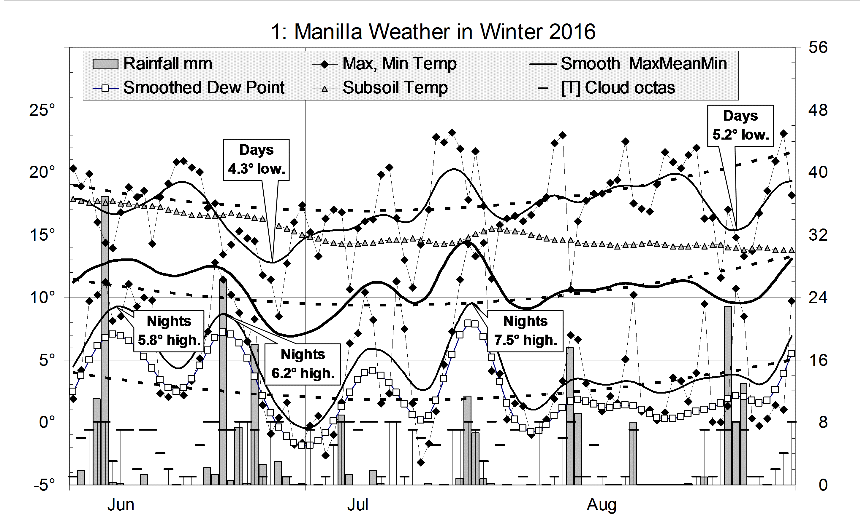 Graphical log, for winter (JJA) of daily values of maximum, minimum and mean temperatures, subsoil (750mm) temperature (all in degrees Celsius), rainfall (mm) and cloud amount (octas). Smoothed values of temperature and early morning dew point use a Gaussian smoothing function with half-width 6 days.