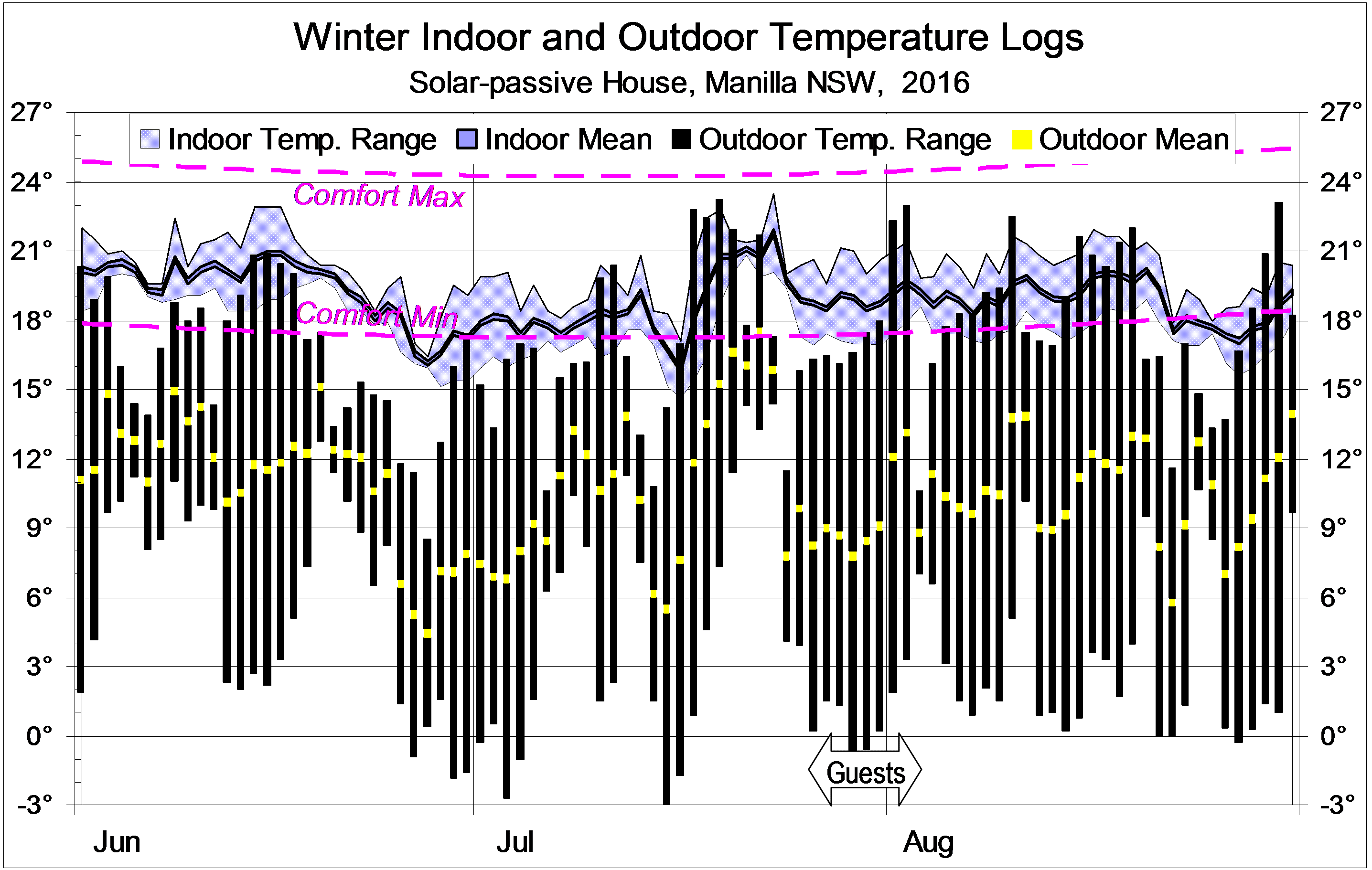 Published September 23, 2016 at 2872 × 1822 in Hard Winter for Solar-passive Next » A graphical log of daily indoor and outdoor temperatures, maximum, minimum and mean, for a high-mass solar-passive house at Manilla NSW.