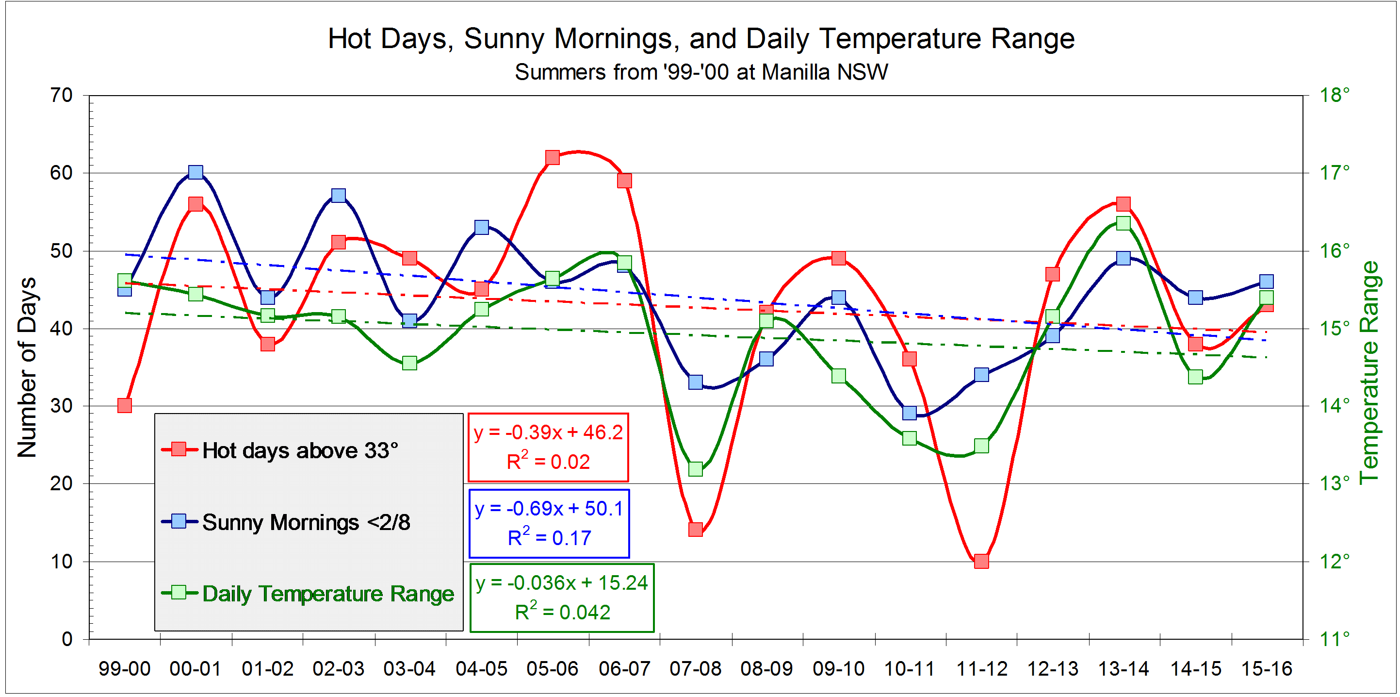 Published September 25, 2016 at 2886 × 1436 in Climate trends for thermal soaring Graph showing number of hot days and sunny mornings, and mean daily temperature range, for summers at Manilla, NSW, from 1999 to 2015.