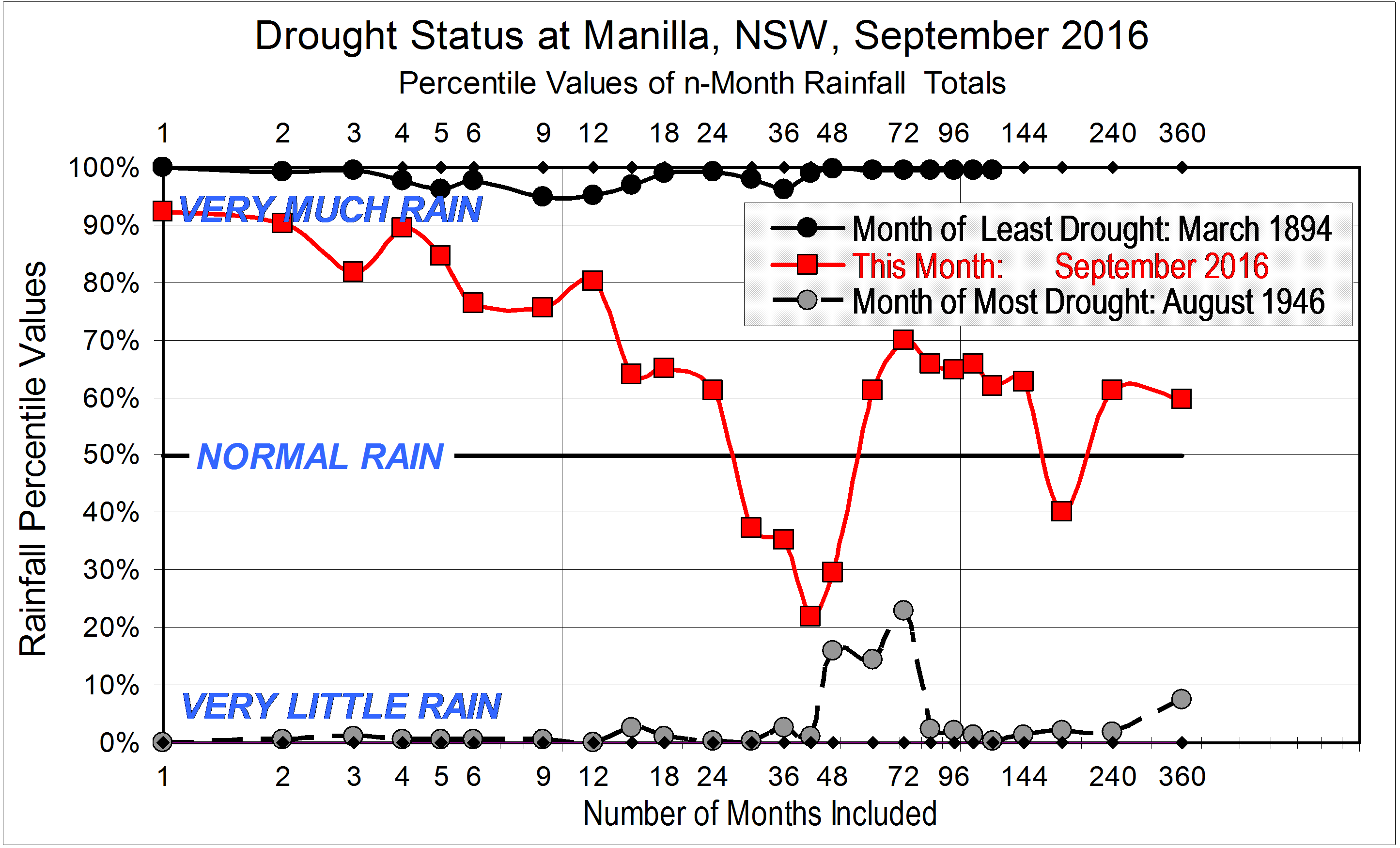 Published October 25, 2016 at 2890 × 1750 in Is There Any Drought Now? The status of drought at Manilla, NSW in September 2016, including short term, medium term, and long term drought. For comparison, the greatest drought and the least drought on record are also showm