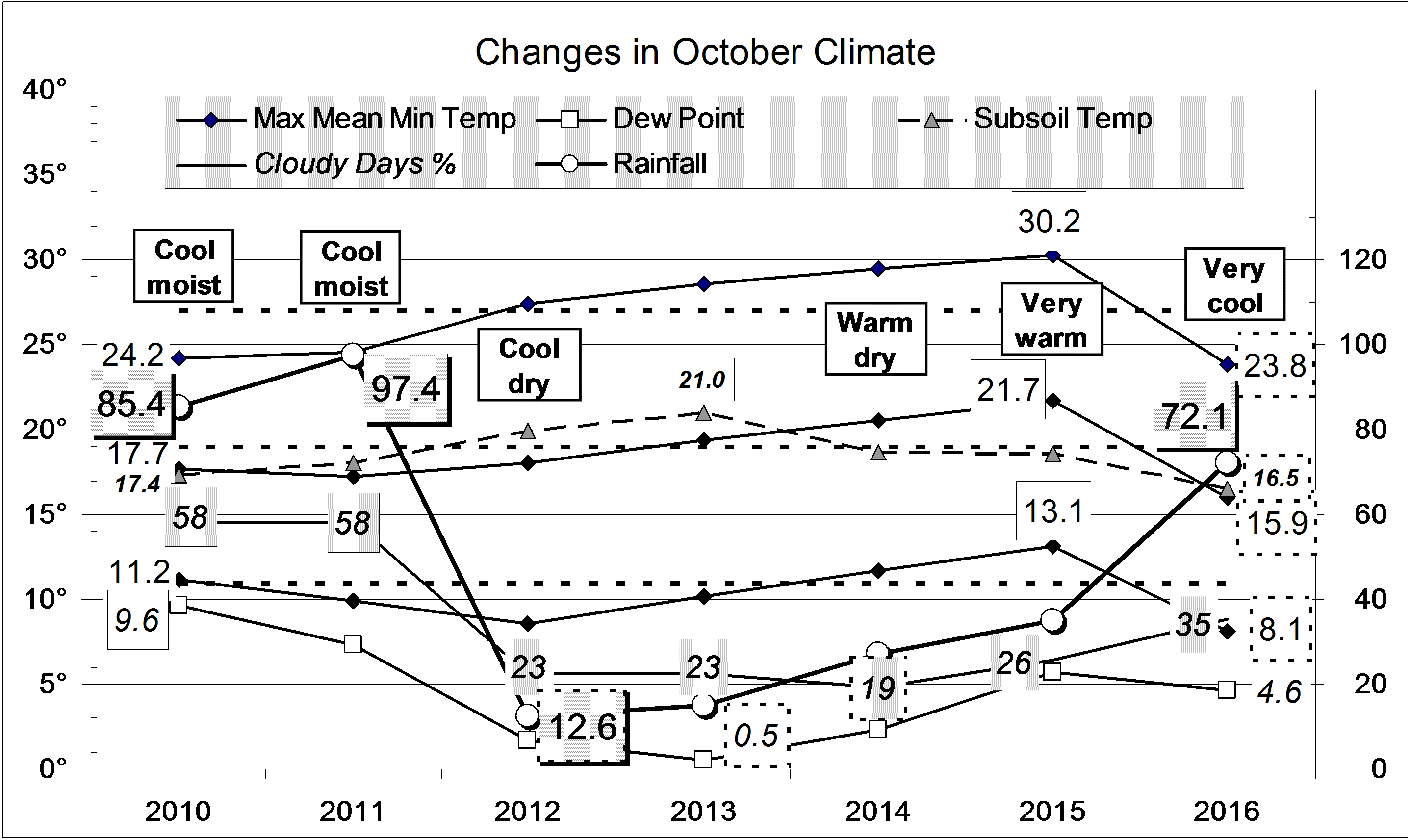 Published November 3, 2016 at 2877 × 1713 in October 2016 was cold « Previous Graphical log of the last seven October months at Manilla, NSW, showing mean values of maximum, minimum and mean temperature, soil temperature, early morning dew point and cloudy days percent, and total monthly rainfall in millimetres.