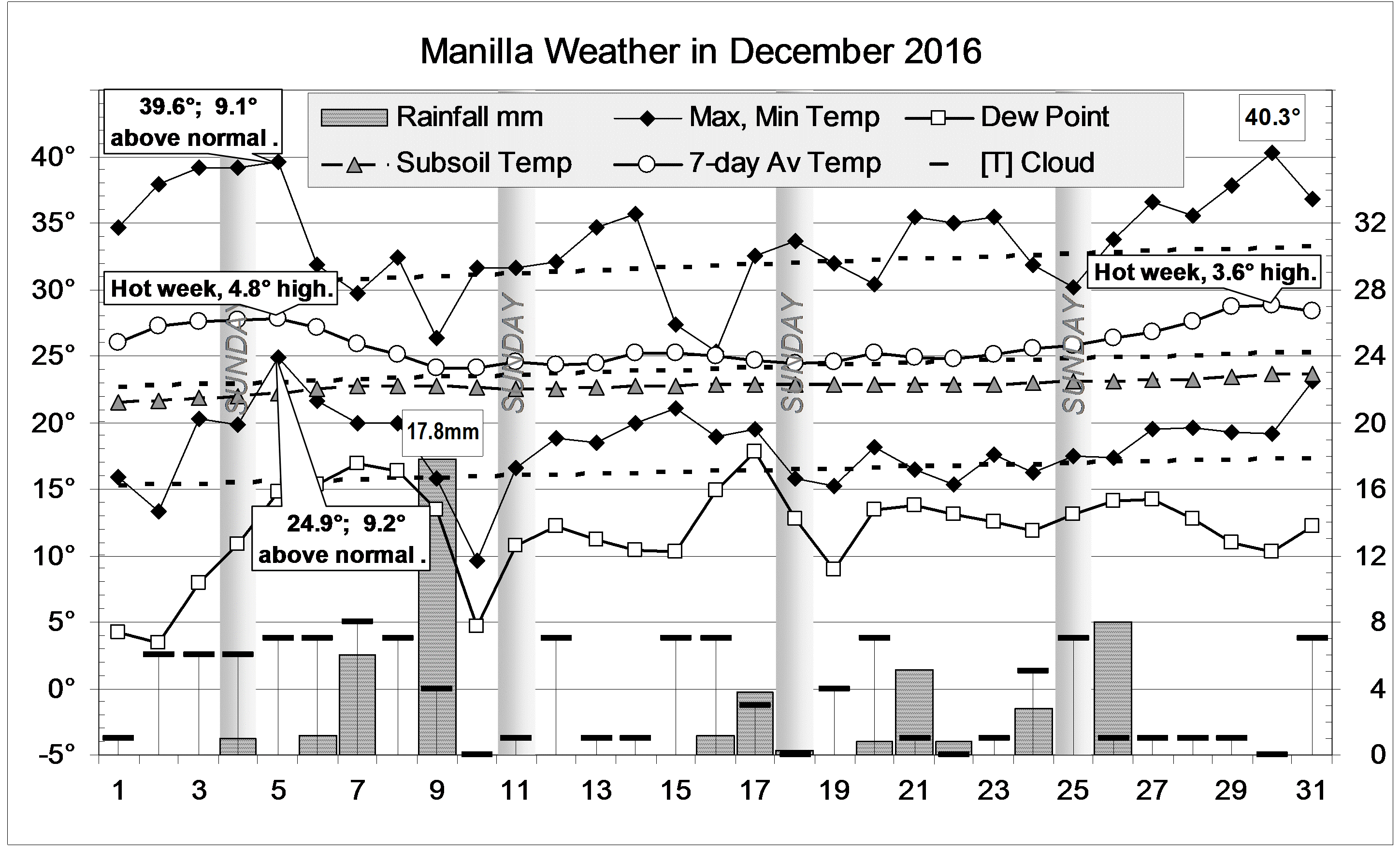 Published January 6, 2017 at 2897 × 1755 in December 2016 was hot « Previous Next » Graphical log, for December 2016, of daily values of maximum and minimum temperatures, subsoil (750mm) temperature and early morning dew point (all in degrees Celsius), rainfall (mm) and cloud amount (octas). Weekly mean temperature also shown.