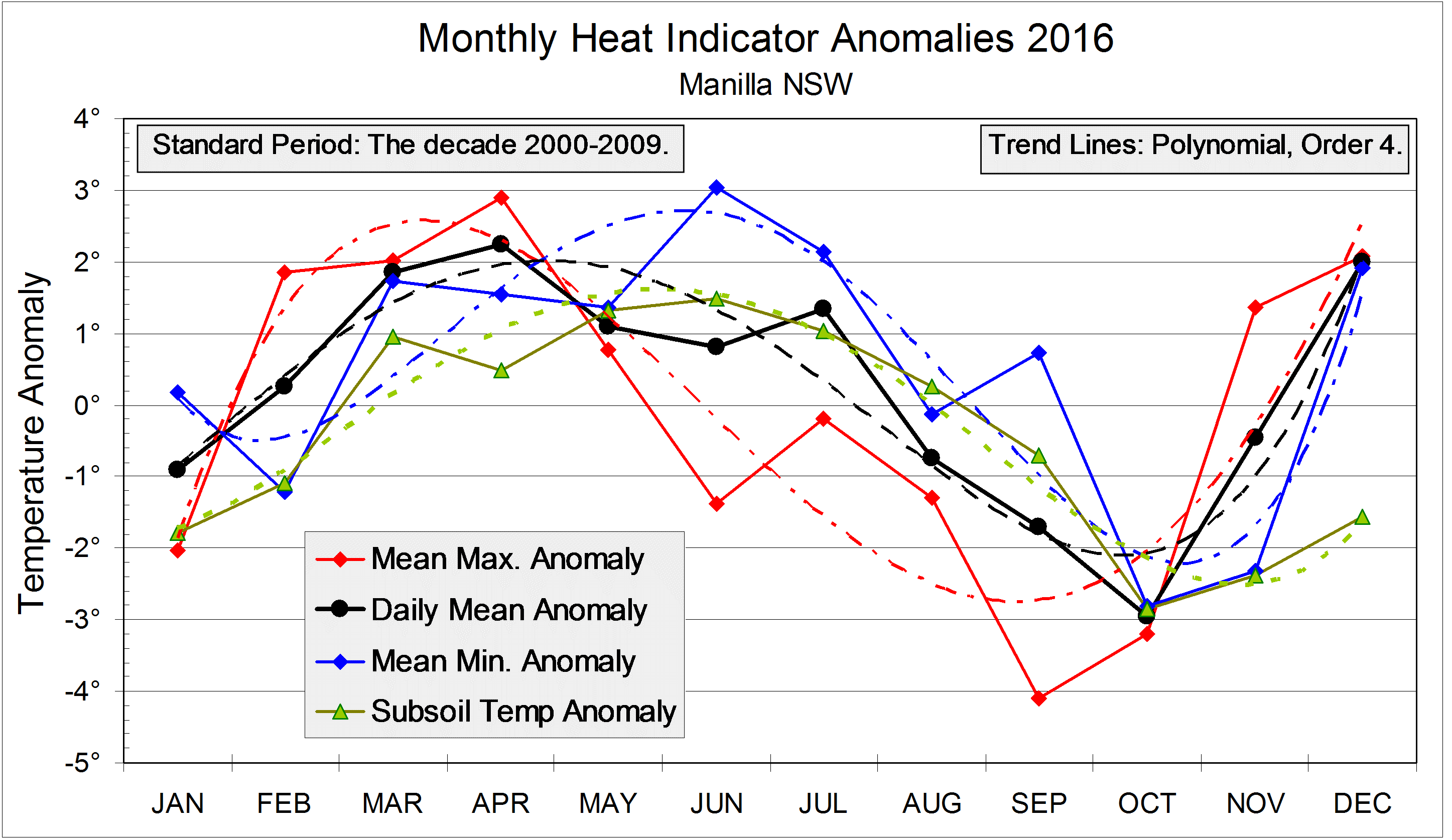 Published January 13, 2017 at 2893 × 1674 in Seasons were strange in 2016 « Previous Next » Graph for the months of 2016 of the anomalies of daily maximum, daily minimum and daily mean air temperature and subsoil (750 mm) temperature at Manilla NSW with fitted trends.