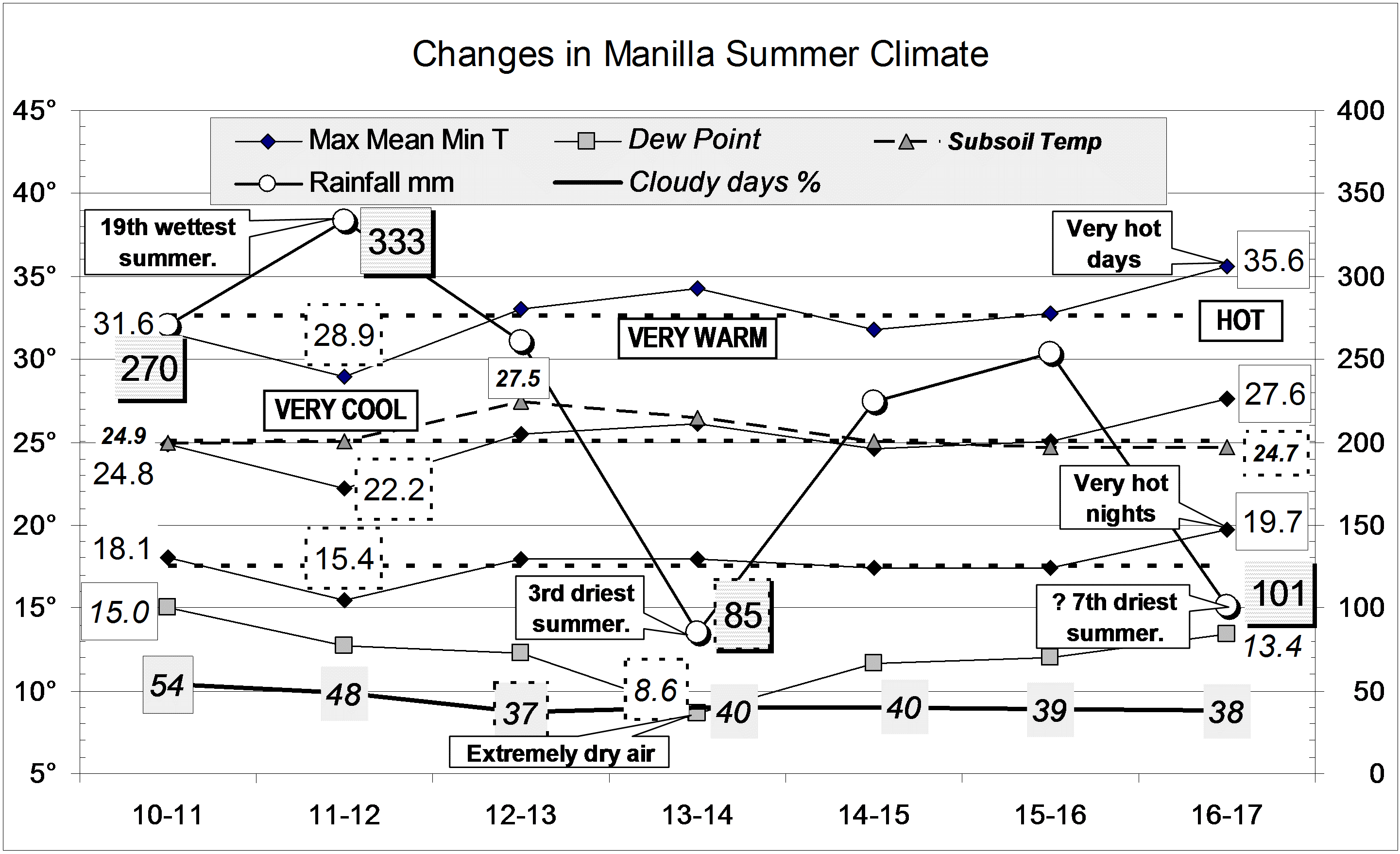 Published March 5, 2017 at 2882 × 1758 in Summer 2016-17 the hottest « Previous Graphical log of the last seven summer seasons (DJF) at Manilla, NSW, showing mean values of maximum, minimum and mean temperature, soil temperature, early morning dew point and cloudy days percent, and total seasonal rainfall in millimetres.