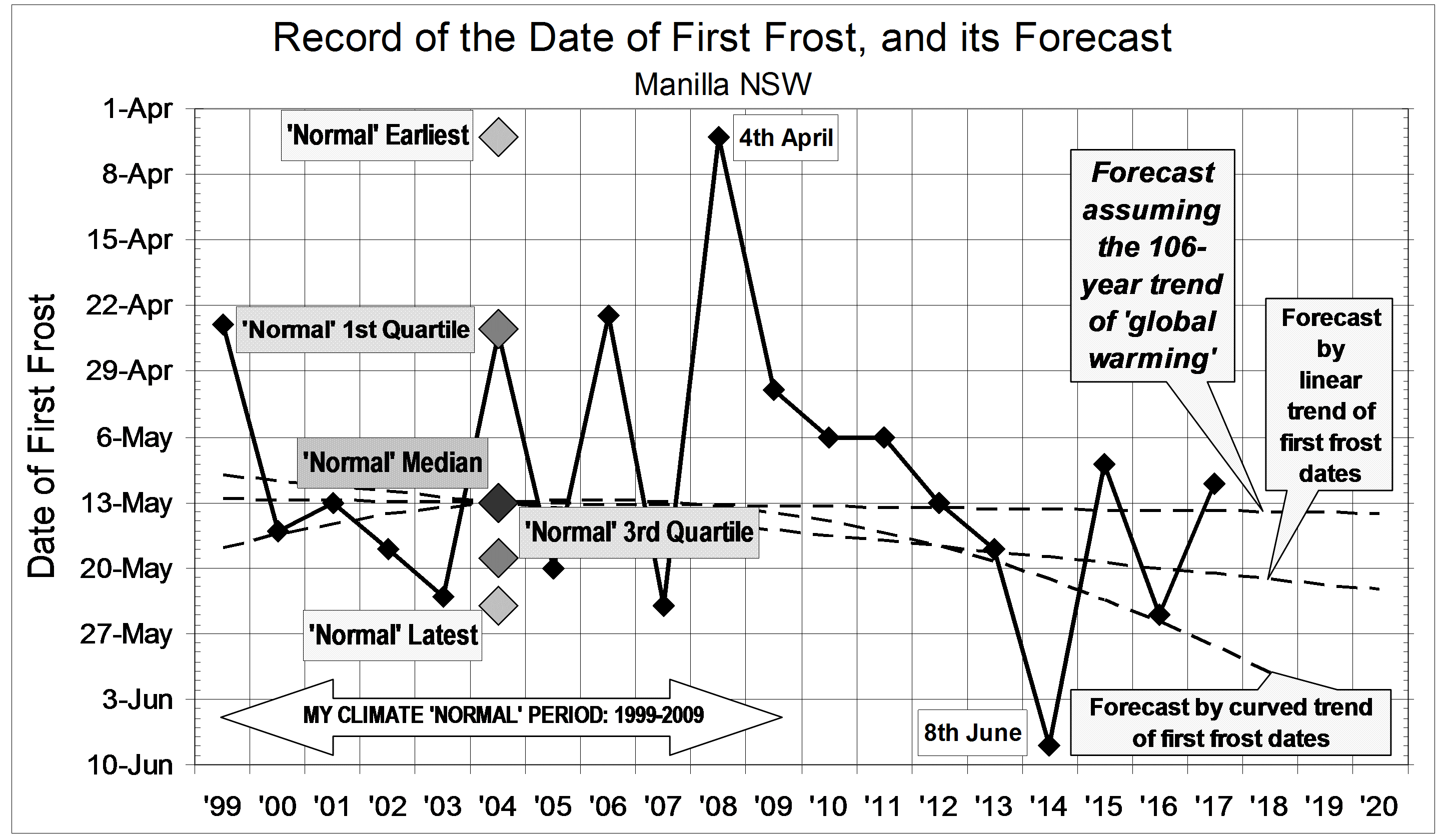 Published May 28, 2017 at 2887 × 1680 in When is the First Frost? Plot, for Manilla, NSW of yearly dates of first frost from 1999 to 2017, with near-term forecasts.