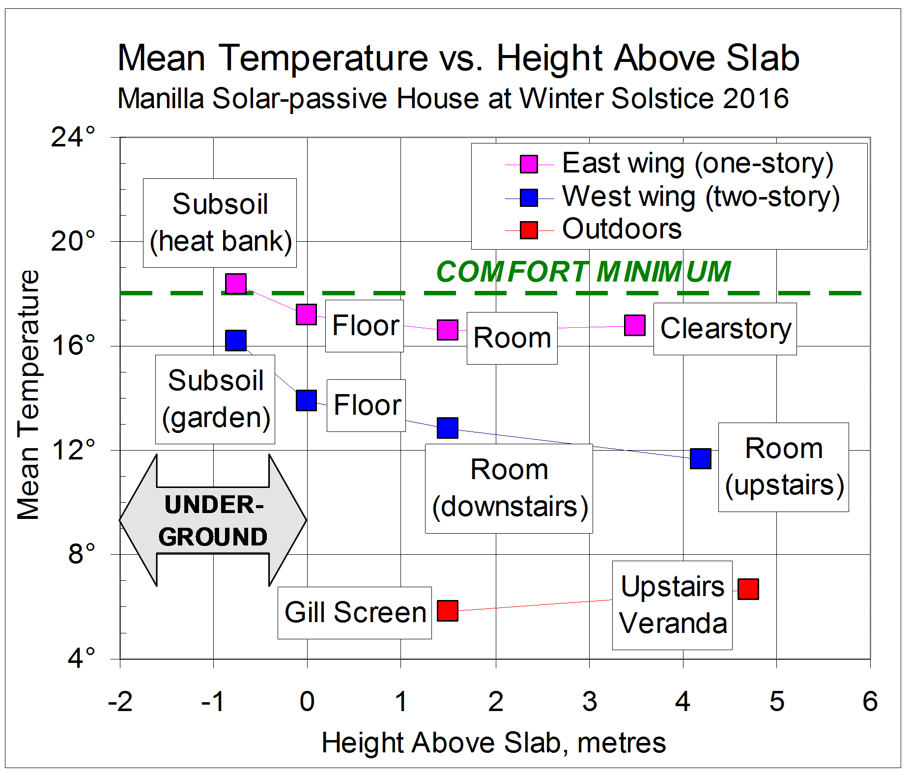 Published June 11, 2017 at 1852 × 1569 in House June warmth profiles: I Next » Six-day mean temperatures in two wings of a solar-passive house and outdoors, graphed against height above the floor slab.