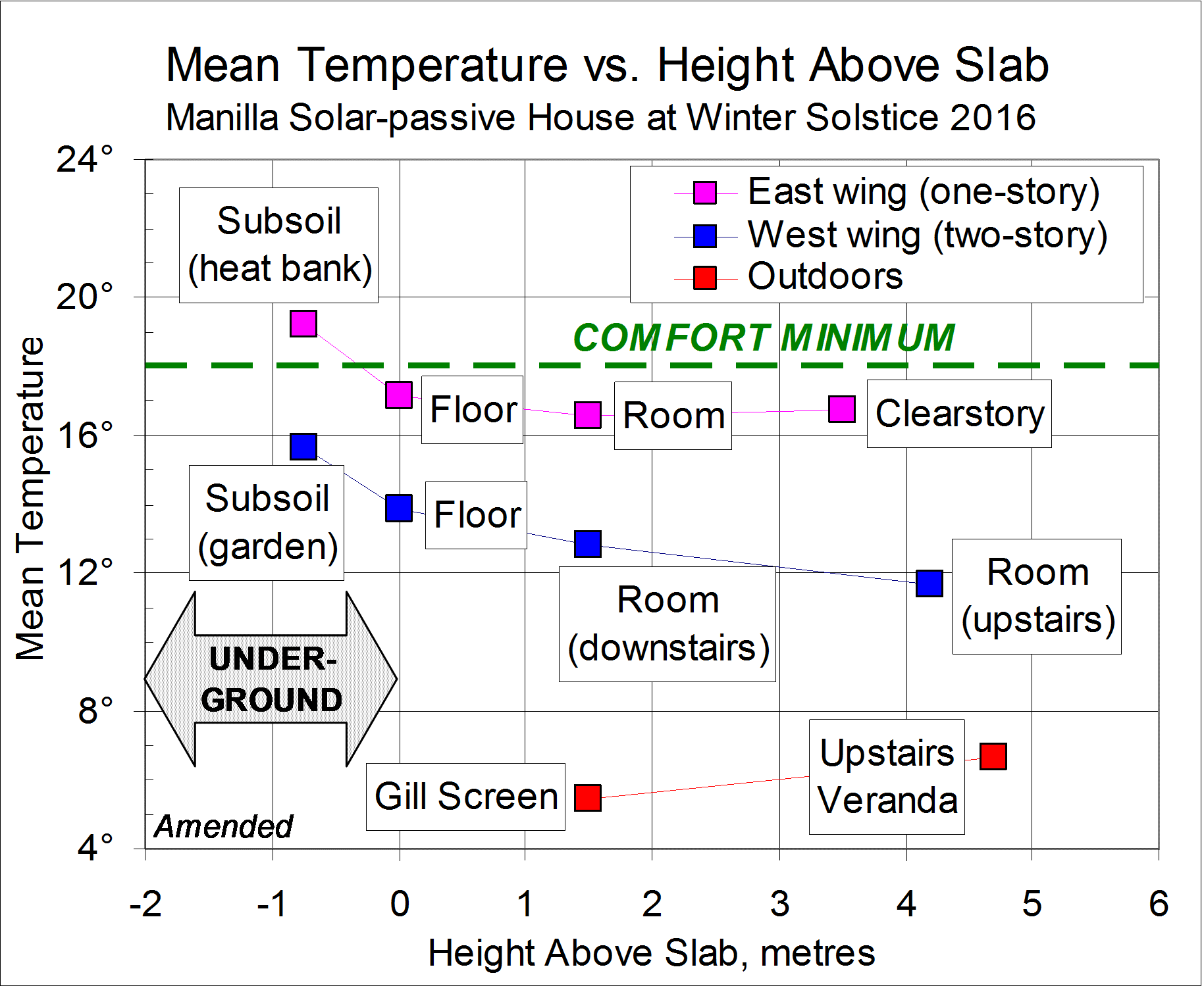 Published June 14, 2017 at 1829 × 1505 in House June warmth profiles: I « Previous Six-day mean temperatures in two wings of a solar-passive house and outdoors, graphed against height above the floor slab.