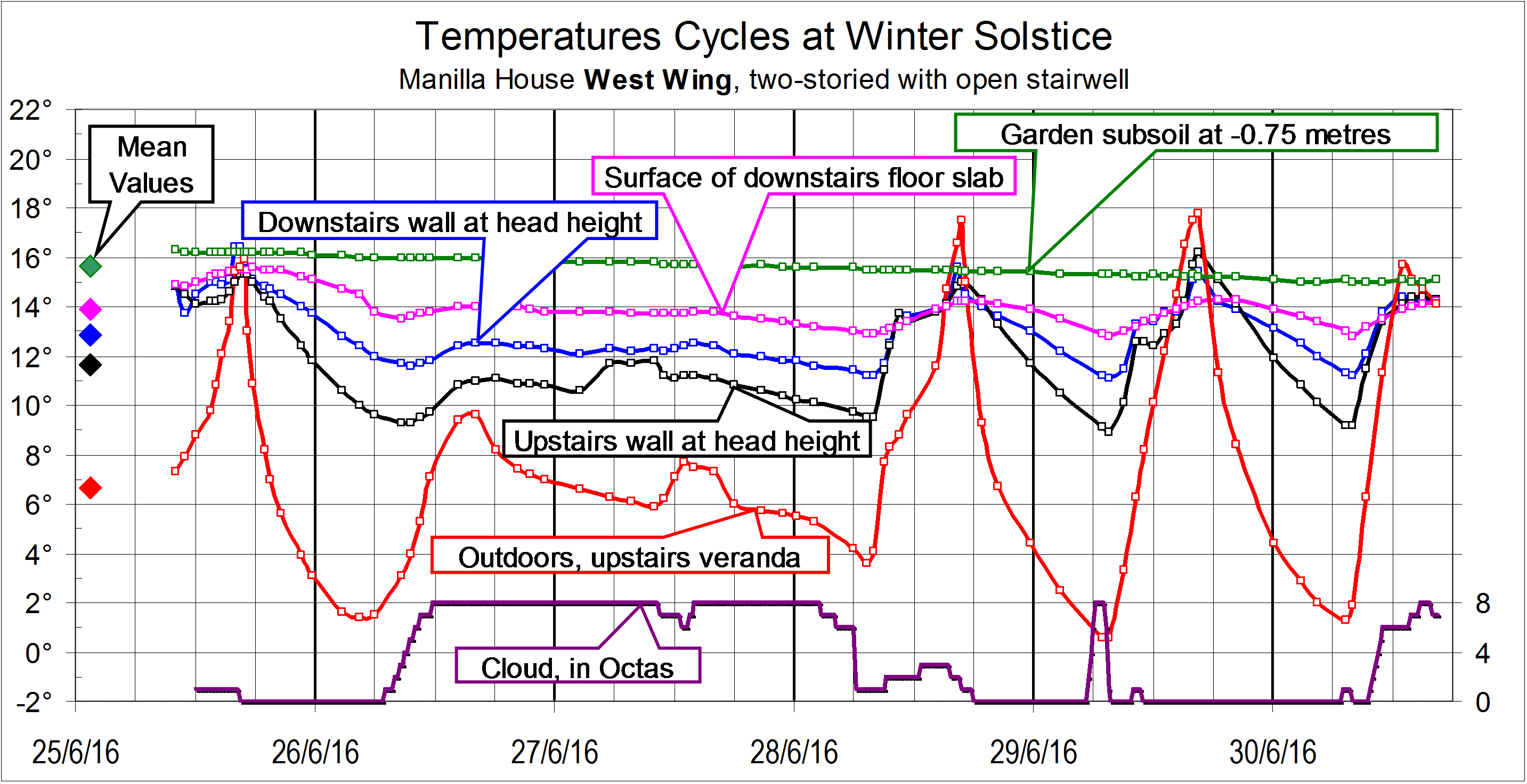 Published June 26, 2017 at 2866 × 1473 in House June warmth profiles: II « Previous Next » Graph showing the daily temperature cycles for five days at mid-winter in the 2-storied west wing of the solar-passive house in Monash Street, Manilla, NSW.