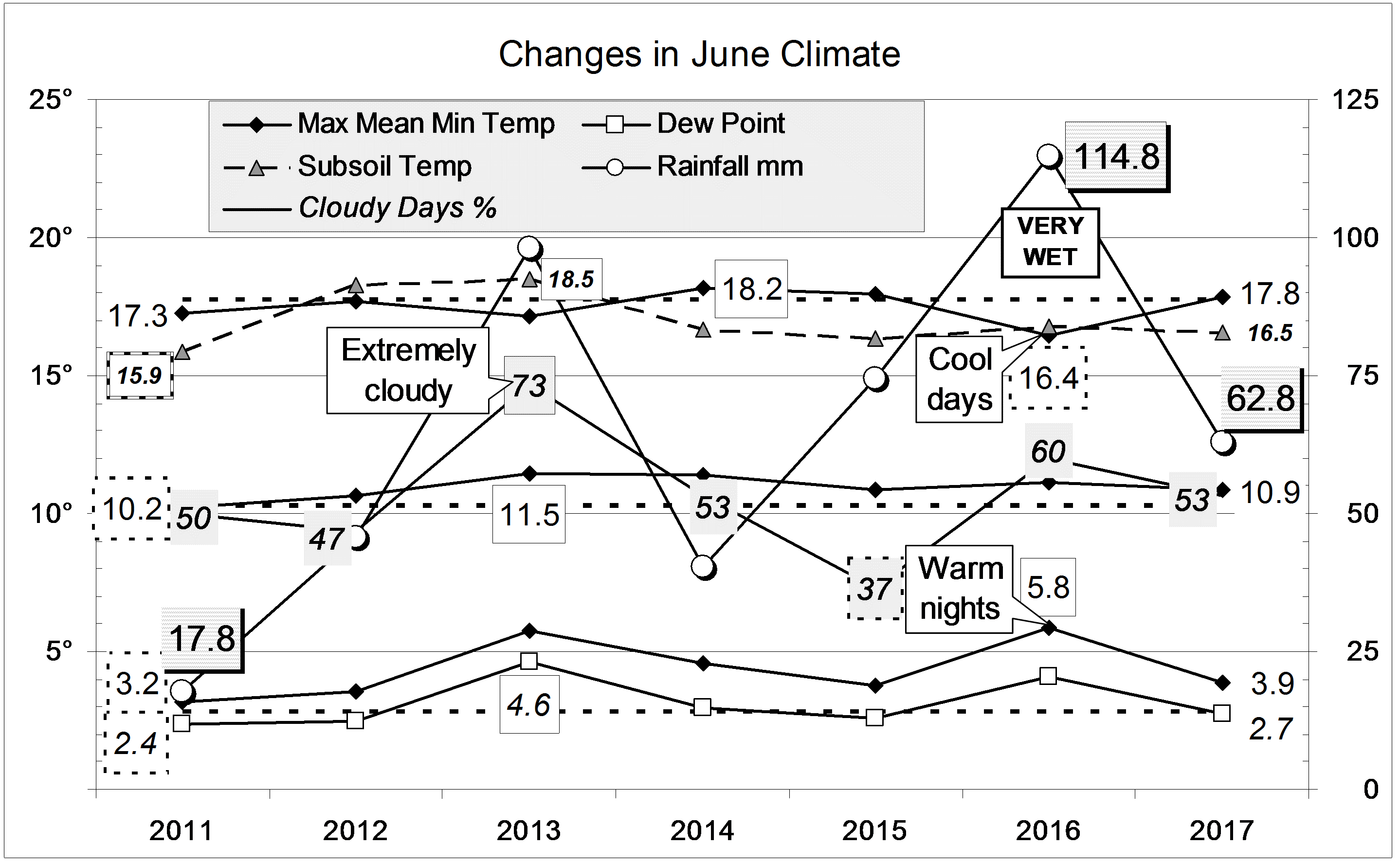 Published July 2, 2017 at 2877 × 1774 in June 2017 not as wet as in 2016 « Previous Graphical log of the last seven June months at Manilla, NSW, showing mean values of maximum, minimum and mean temperature, soil temperature, early morning dew point and cloudy days percent, and total monthly rainfall in millimetres.