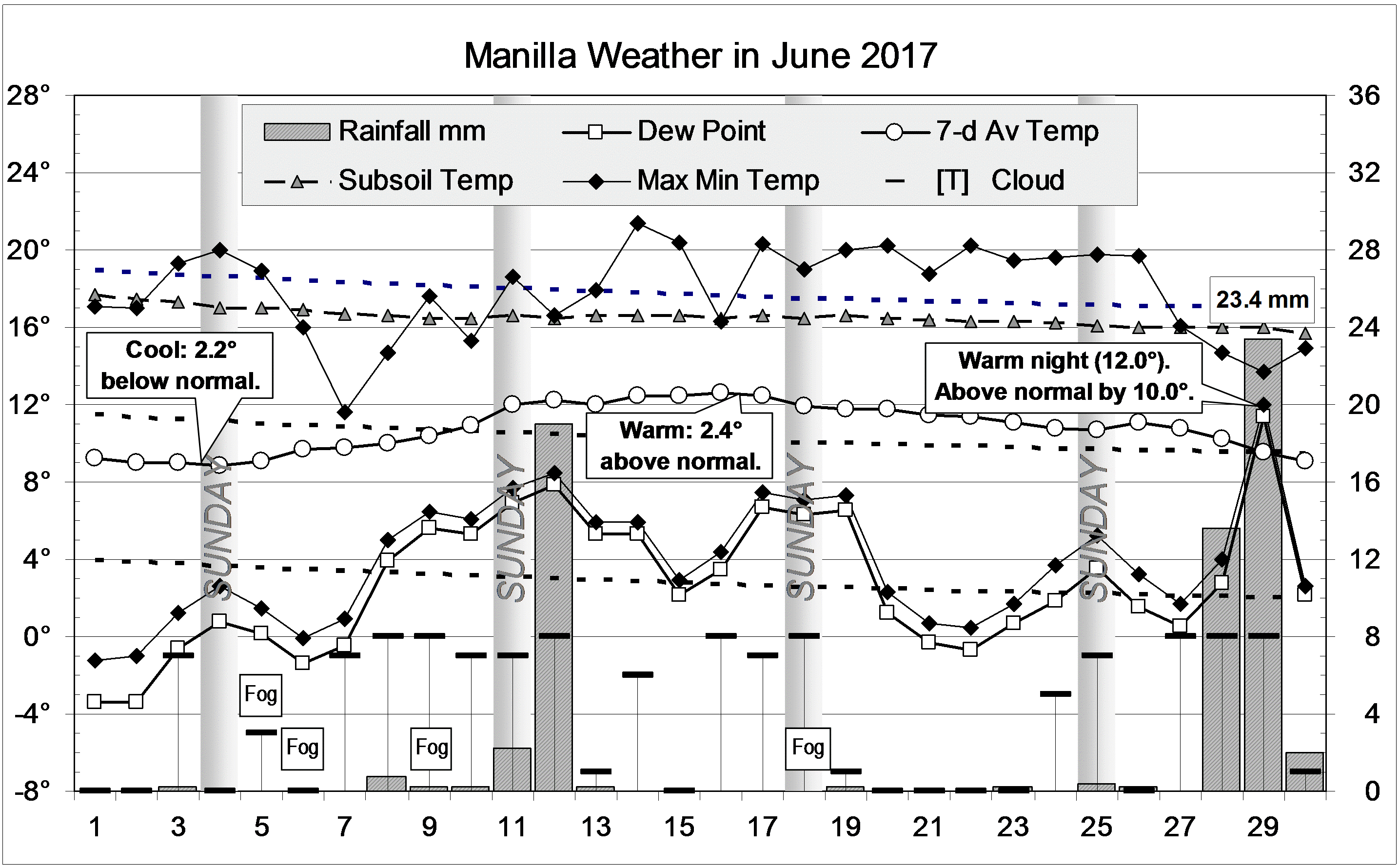 Published July 2, 2017 at 2869 × 1780 in June 2017 not as wet as in 2016 « Previous Next » Graphical log, for June 2017, of daily values of maximum and minimum temperatures, subsoil (750mm) temperature and early morning dew point (all in degrees Celsius), rainfall (mm) and cloud amount (octas). Weekly mean temperature also shown.