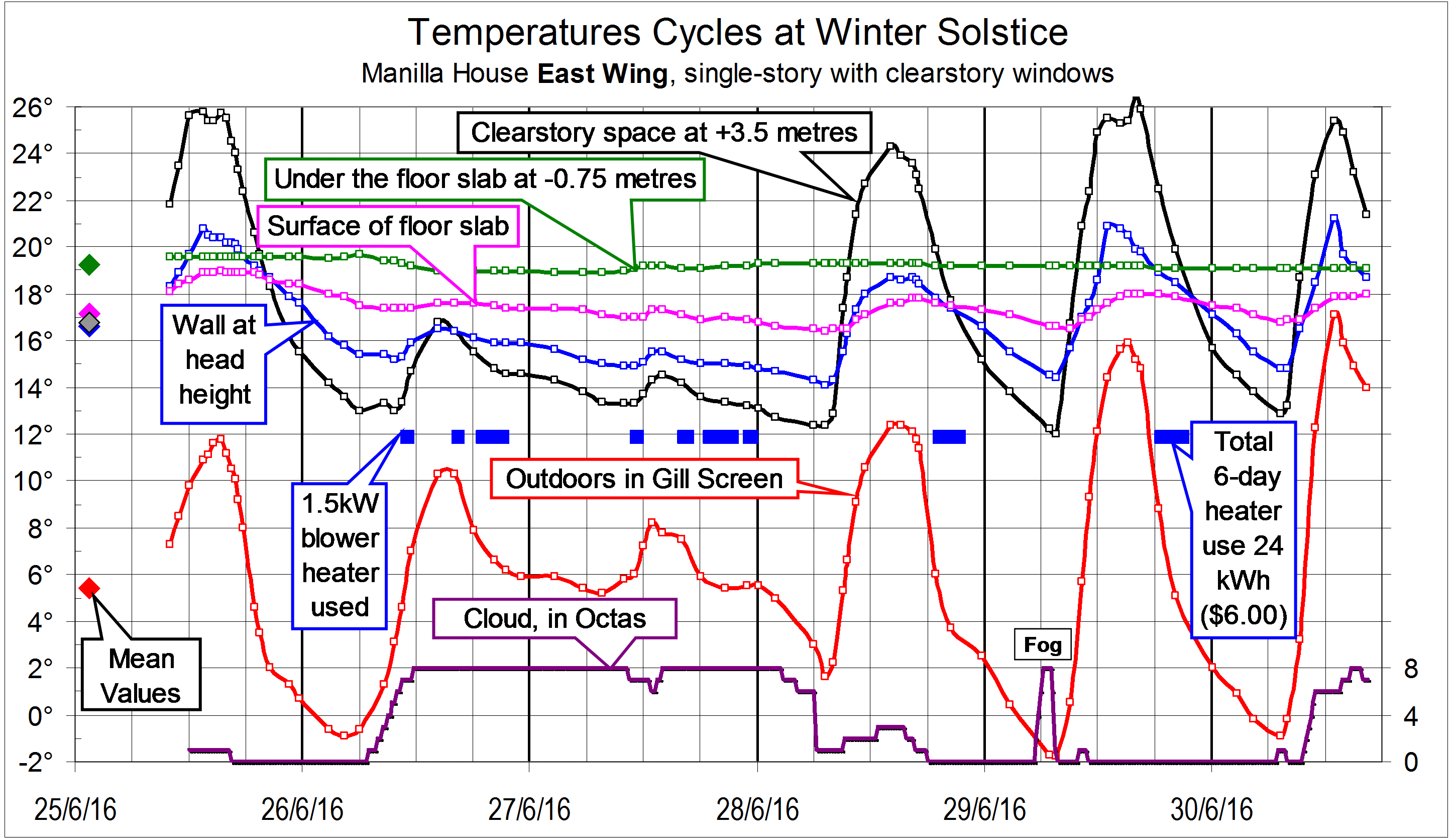 Published July 5, 2017 at 2899 × 1667 in House June warmth profiles: III Next » Graph showing the daily temperature cycles for five days at mid-winter in the single-story-with-clearstory east wing of the solar-passive house in Monash Street, Manilla, NSW.