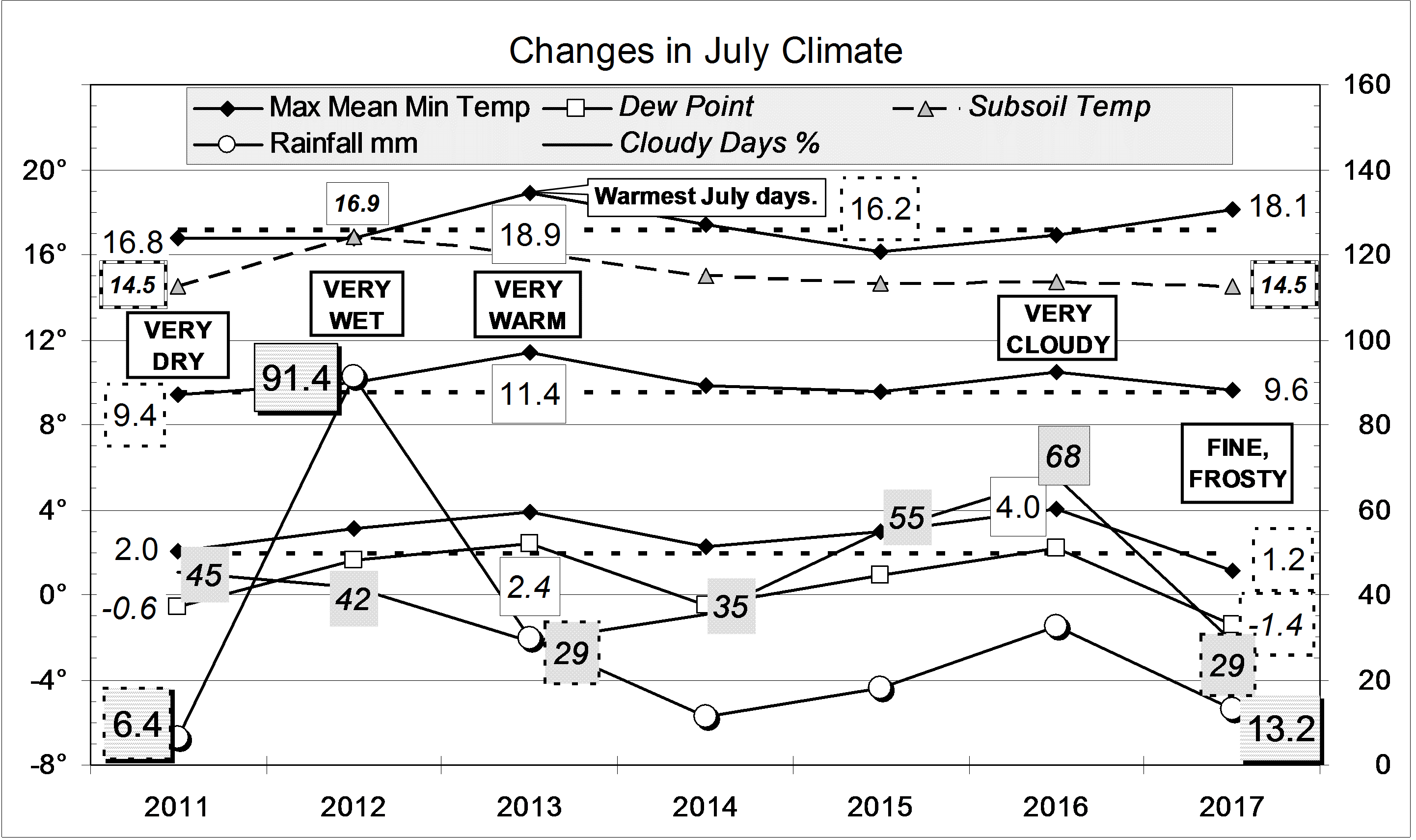 Published August 2, 2017 at 2884 × 1710 in July 2017 fine with cold nights « Previous Graphical log of the last seven July months at Manilla, NSW, showing mean values of maximum, minimum and mean temperature, soil temperature, early morning dew point and cloudy days percent, and total monthly rainfall in millimetres.