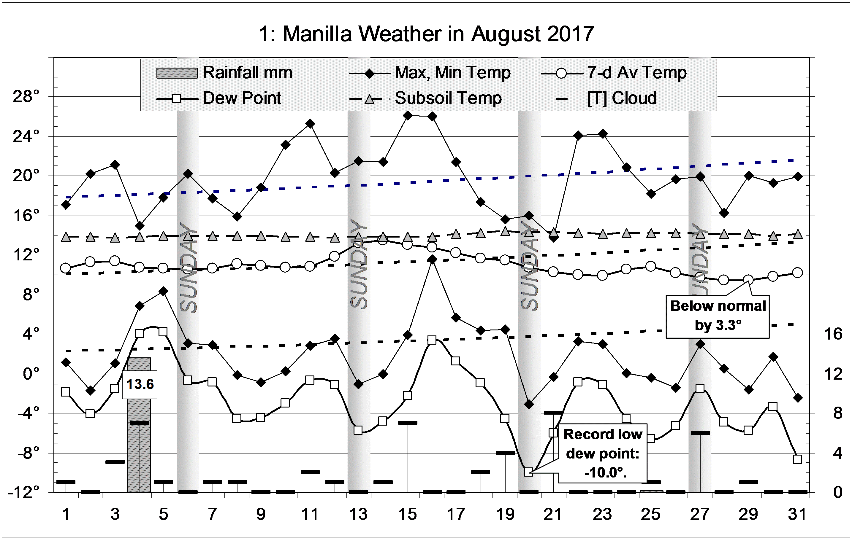Published September 3, 2017 at 2870 × 1814 in August 2017 arid and sunny « Previous Next » Graphical log, for August 2017, of daily values of maximum and minimum temperatures, subsoil (750mm) temperature and early morning dew point (all in degrees Celsius), rainfall (mm) and cloud amount (octas). Weekly mean temperature also shown.
