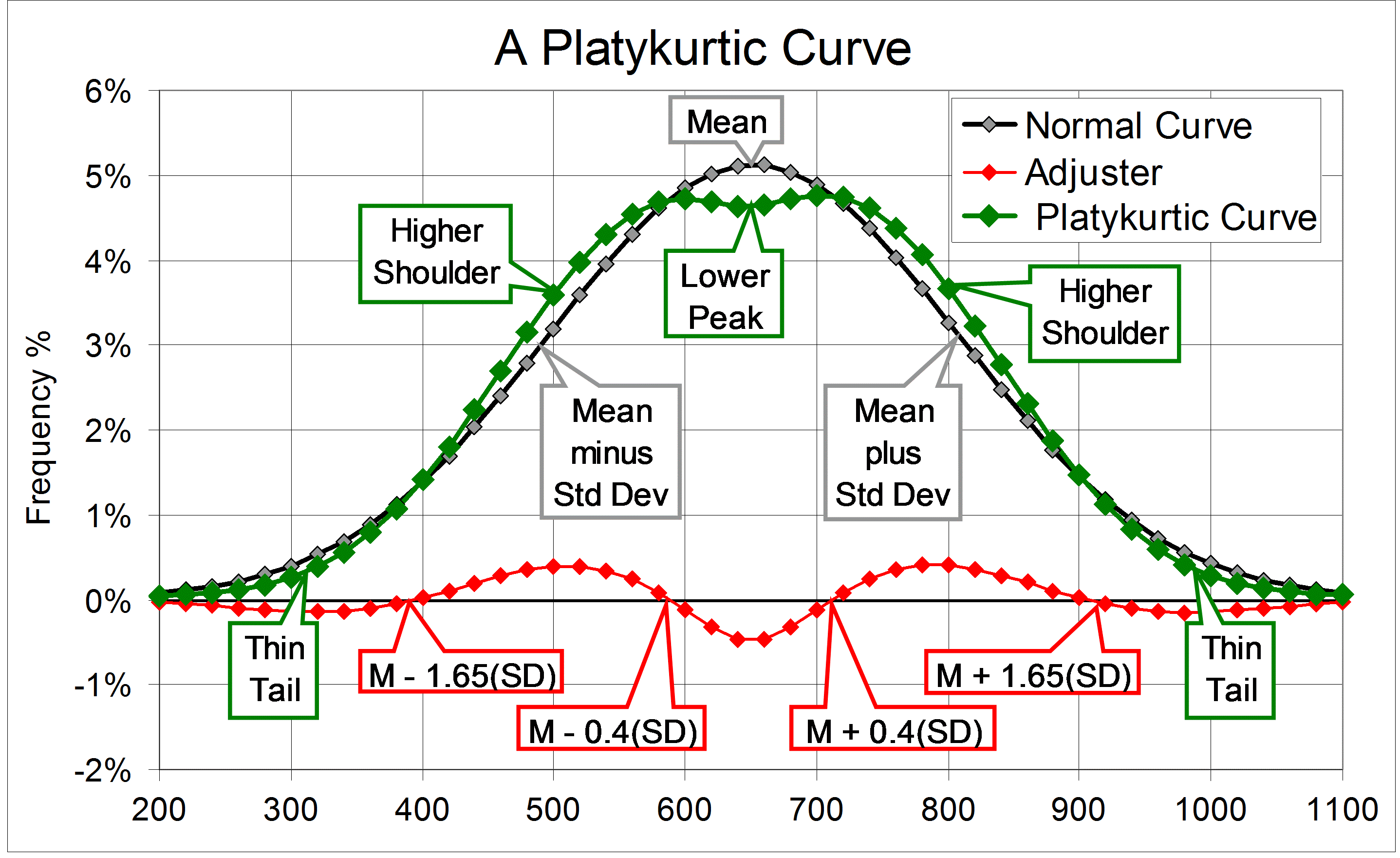 Published October 12, 2017 at 2875 × 1761 in Kurtosis, Fat Tails, and Extremes « Previous Adding an inverted “adjuster” function to a curve of normal distribution converts it to a platykurtic curve with higher shoulders, a lower peak, and thin tails.
