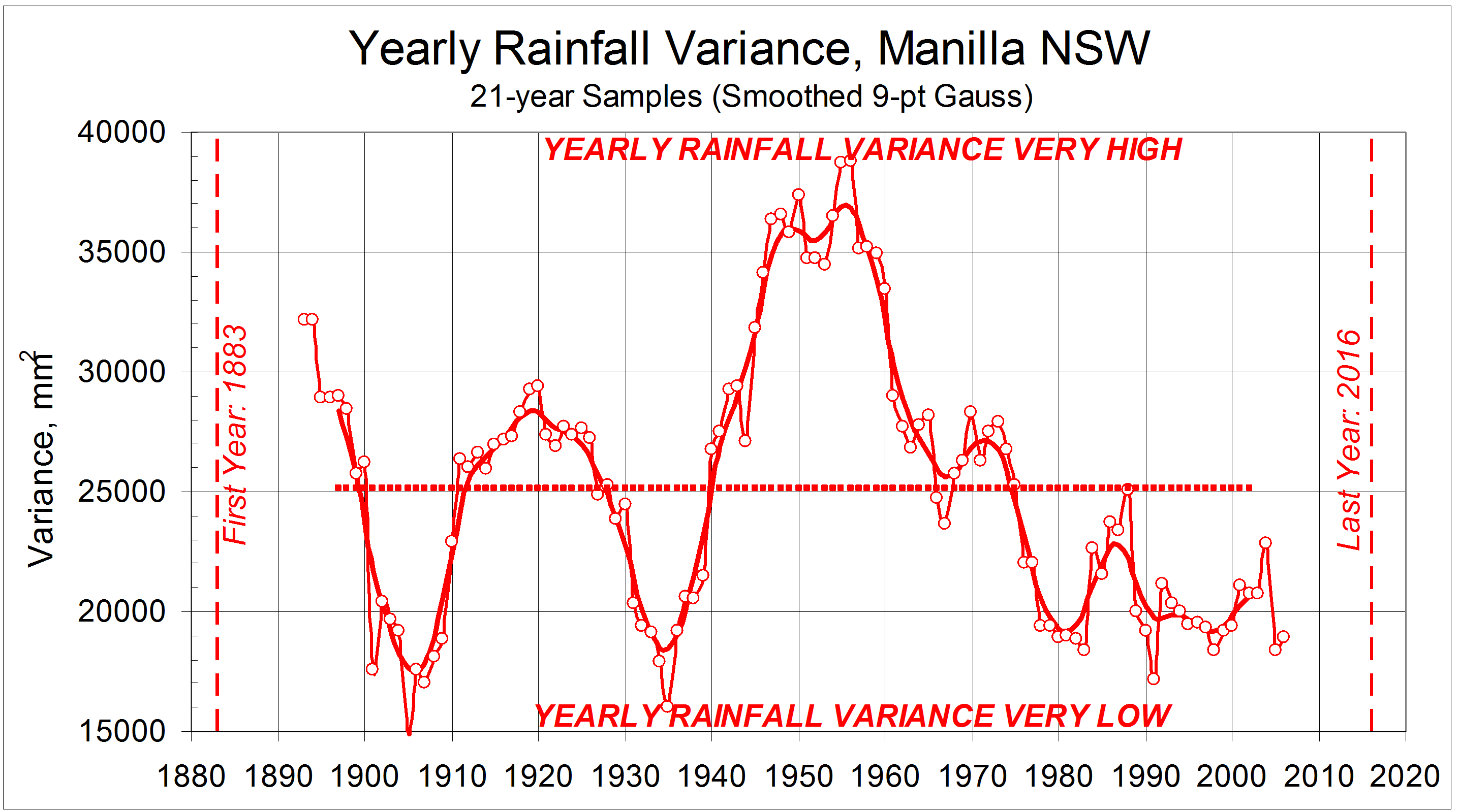 Published November 15, 2017 at 2873 × 1599 in Moments of Manilla’s Yearly Rainfall History « Previous Next » The historic variation of Manilla annual rainfall second moment (variance), using 21-year samples.