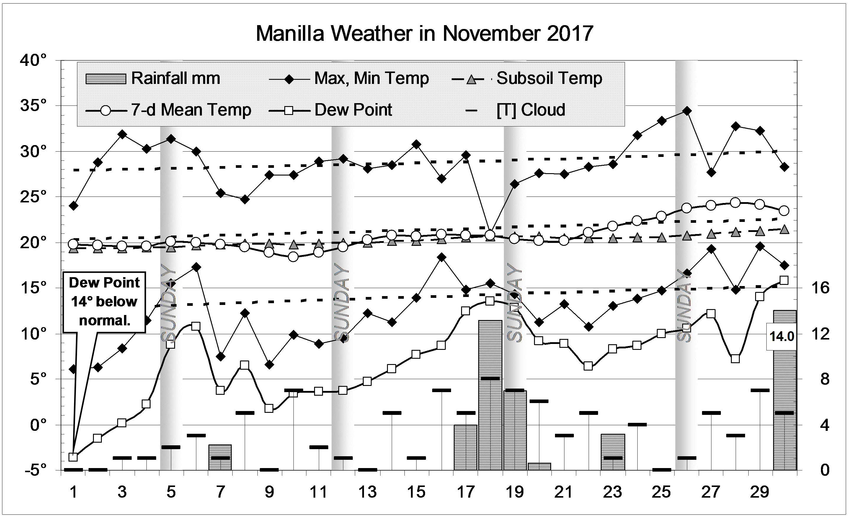 Published December 2, 2017 at 2876 × 1753 in November 2017 dry again with cold nights « Previous Next » Graphical log, for November 2017, of daily values of maximum and minimum temperatures, subsoil (750mm) temperature and early morning dew point (all in degrees Celsius), rainfall (mm) and cloud amount (octas). Weekly mean temperature also shown.