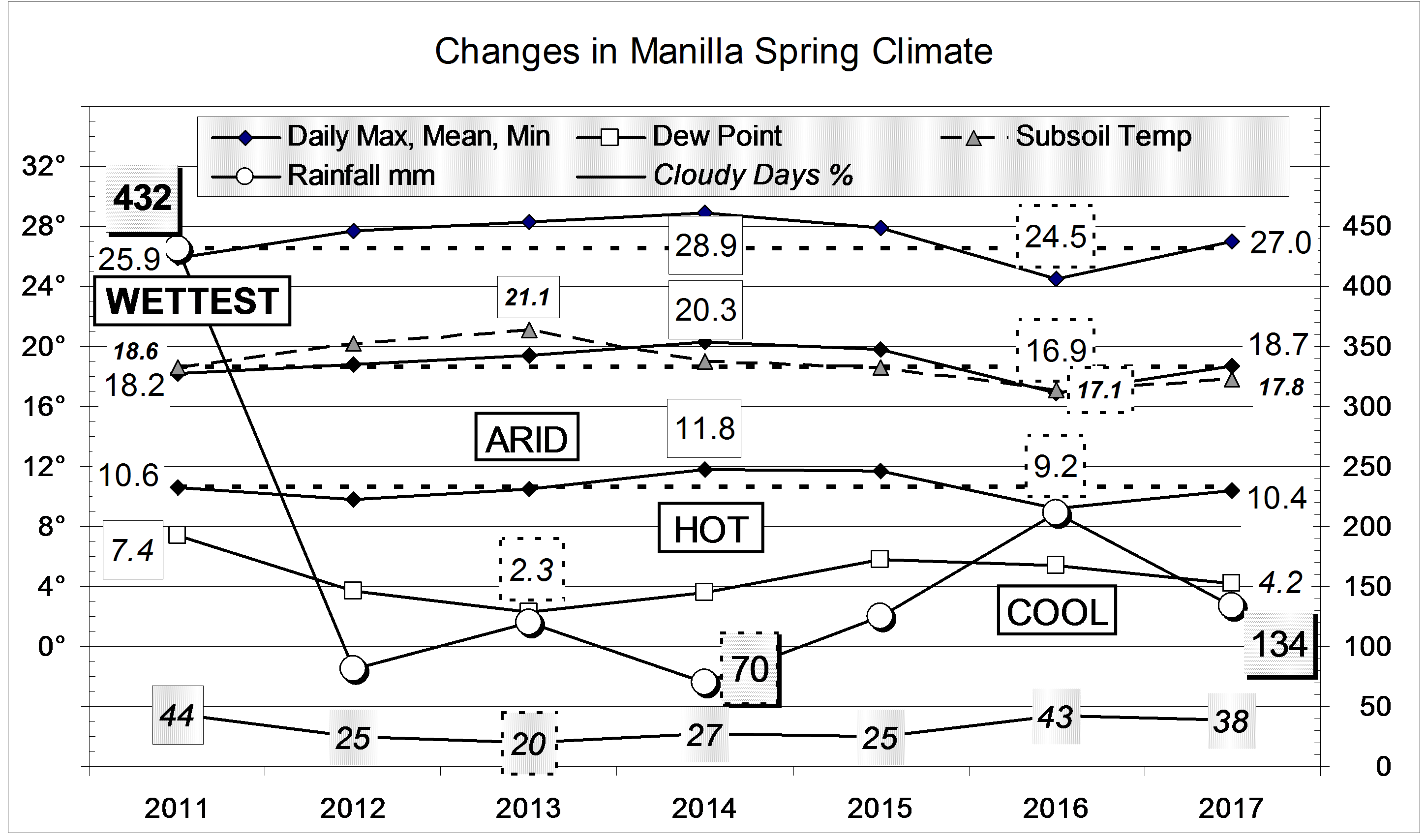 Published December 8, 2017 at 2901 × 1708 in Spring 2017 slightly dry « Previous Graphical log of the last seven spring seasons (SON) at Manilla, NSW, showing mean values of maximum, minimum and mean temperature, soil temperature, early morning dew point and cloudy days percent, and total seasonal rainfall in millimetres.