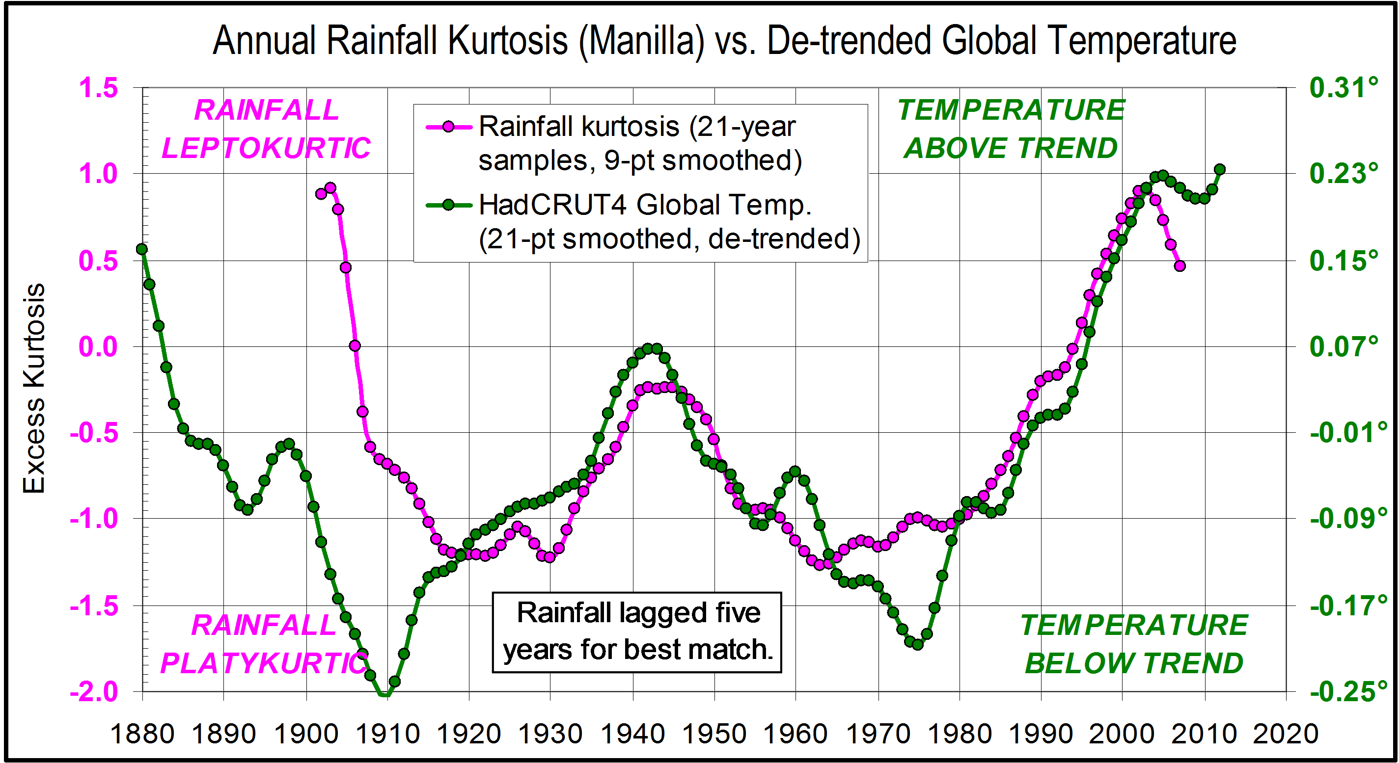 Published December 21, 2017 at 2849 × 1555 in Rainfall kurtosis matches HadCRUT4 « Previous Next » History of annual rainfall kurtosis at Manilla NSW and detrended HadCRUT4 global temperature. Smoothed dual axis line chart.