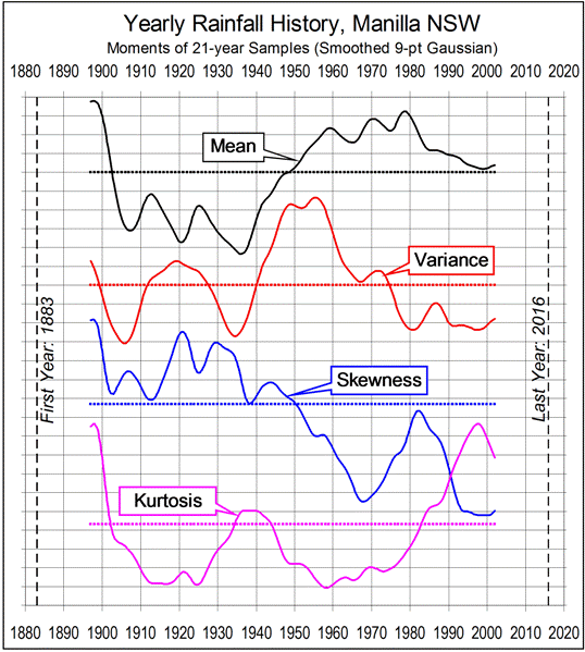 Published November 16, 2017 at 538 × 599 in Rainfall kurtosis matches HadCRUT4 Next » The historic variation of Manilla annual rainfall as four moments: mean, variance, skewness, and kurtosis, using 21-year samples.