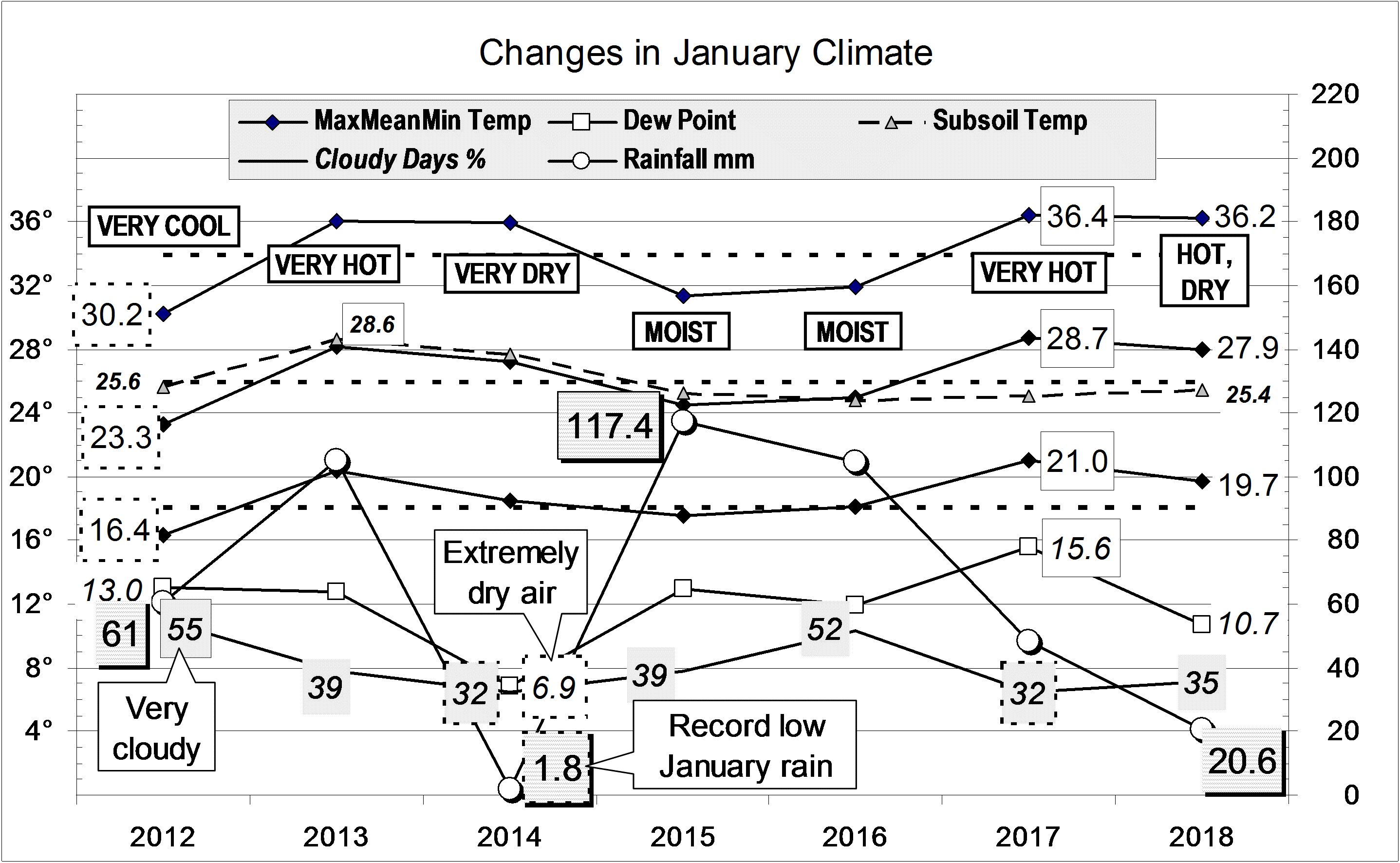 Published February 4, 2018 at 2875 × 1772 in January 2018 hot and dry « Previous Graphical log of the last seven January months at Manilla, NSW, showing mean values of maximum, minimum and mean temperature, soil temperature, early morning dew point and cloudy days percent, and total monthly rainfall in millimetres.
