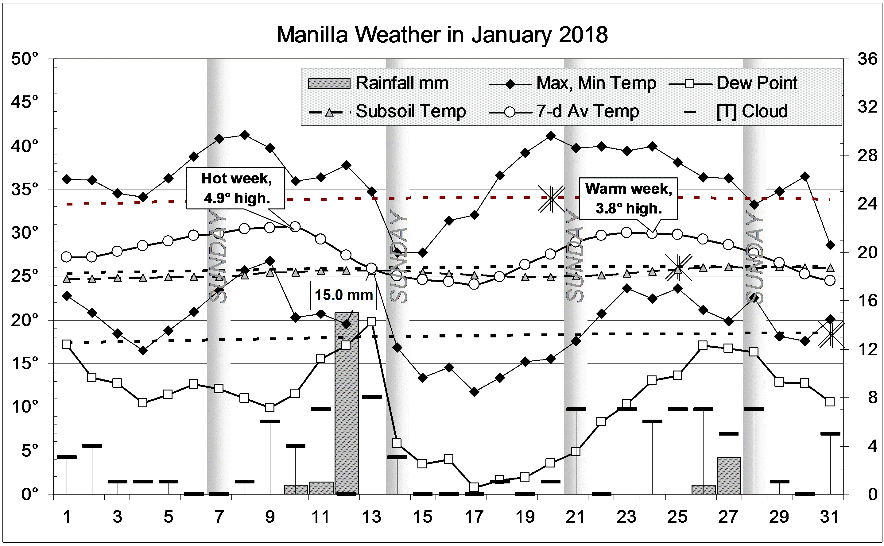 Published February 4, 2018 at 2880 × 1780 in January 2018 hot and dry « Previous Next » Graphical log, for January 2018, of daily values of maximum and minimum temperatures, subsoil (750mm) temperature and early morning dew point (all in degrees Celsius), rainfall (mm) and cloud amount (octas). Weekly mean temperature also shown.