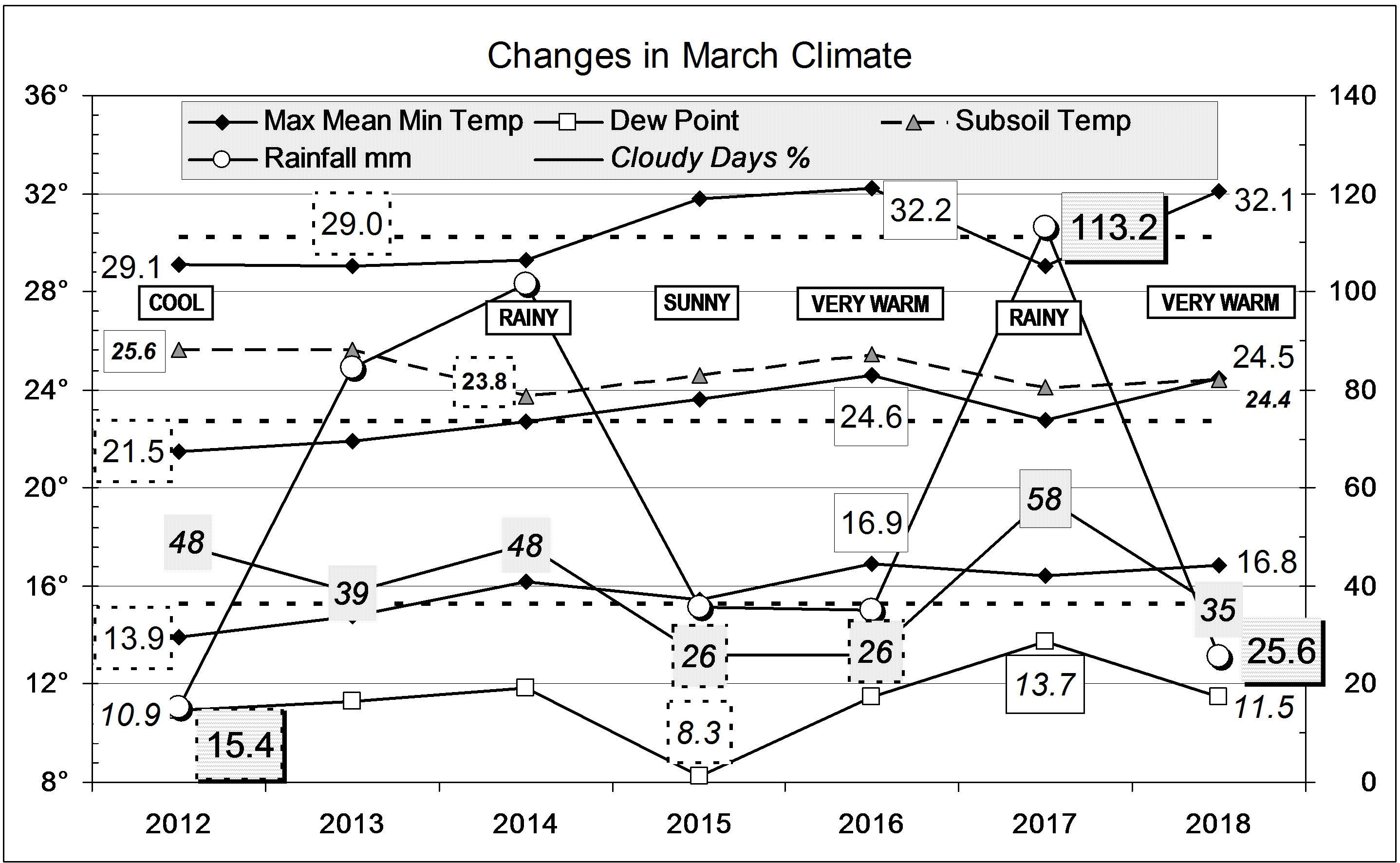 18Marclimate Published April 8, 2018 at 2875 × 1772 in March 2018 very warm indeed « Previous Graphical log of the last seven March months at Manilla, NSW, showing mean values of maximum, minimum and mean temperature, soil temperature, early morning dew point and cloudy days percent, and total monthly rainfall in millimetres.