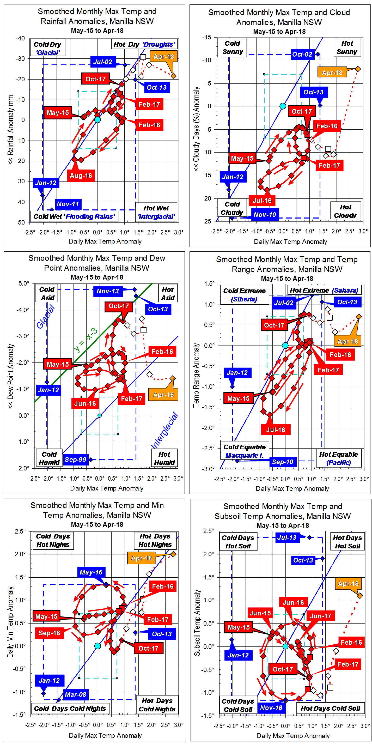 Blue diamonds and the dashed blue rectangle show the extreme values in the fully smoothed data record since September 1999.