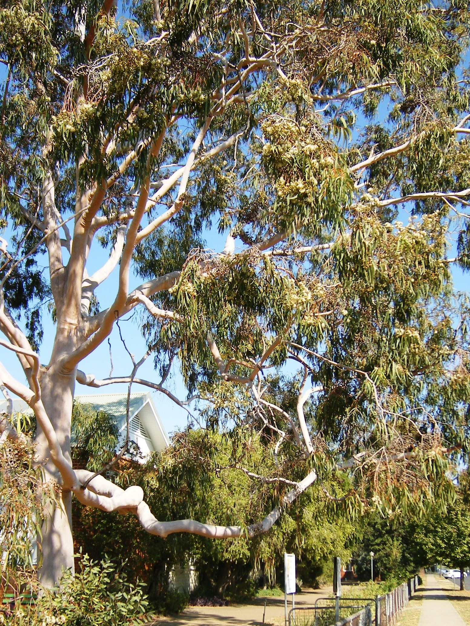 The Lemon-scented Gum (Eucalyptus citriodora) is a tall handsome tree with smooth white bark. A native of coastal Queensland, it thrives when planted in larger gardens in Manilla. It contrasts with the local White Box trees (Eucalyptus albens) which have rough grey bark and crooked trunks (See photo: “White Box at Sunset”). Of 500 species of Eucalyptus, only two species have lemon-scented leaves (E. citriodora and E. staigerana).