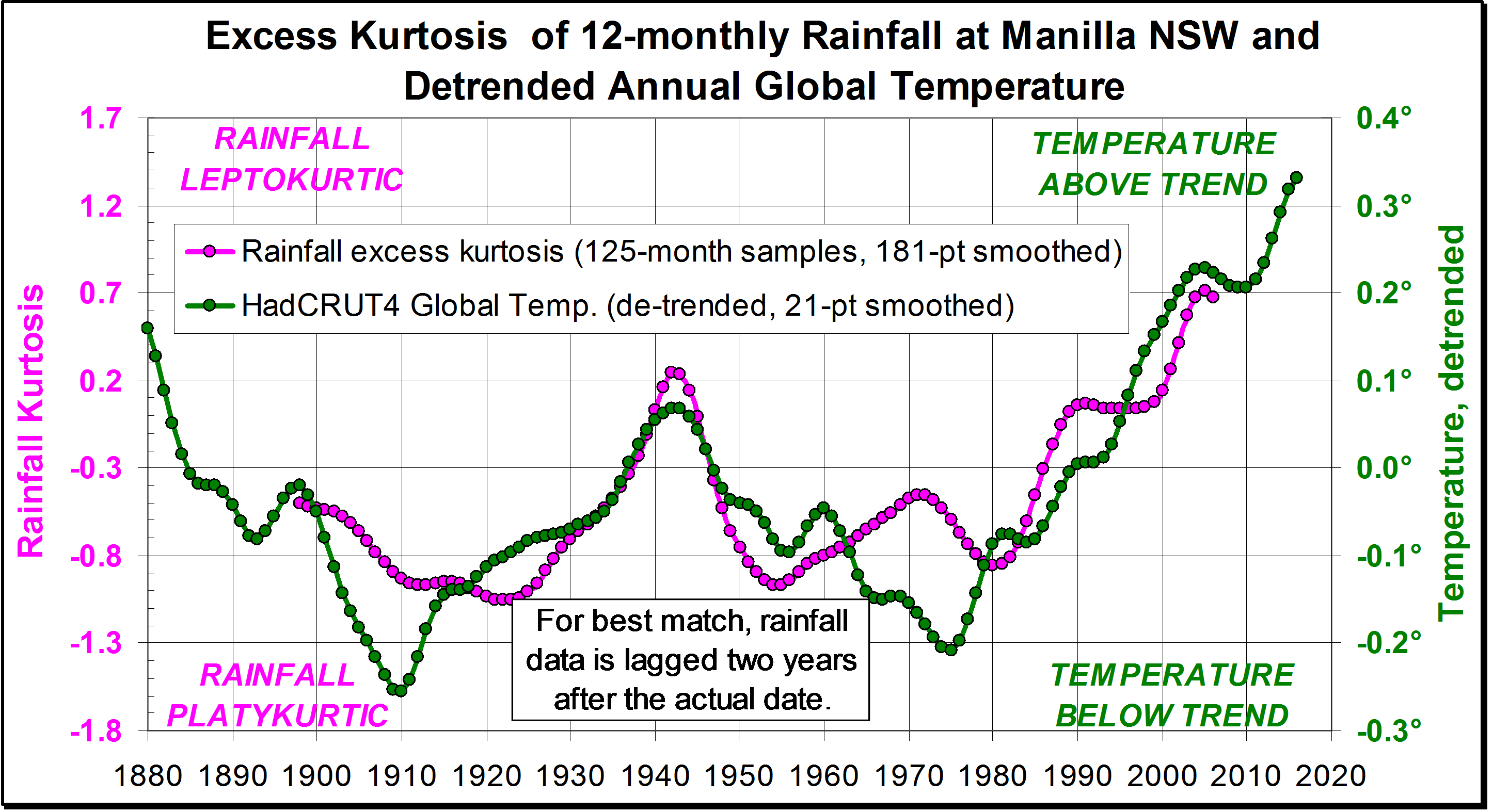 Published May 20, 2018 at 2892 × 1574 in Rainfall kurtosis vs. HadCRUT4, revised Next » The pattern of rainfall kurtosis at Manilla NSW compared with that of detrended HadCRUT4 near-surface global temperature, plotted as a dual-axis line chart.