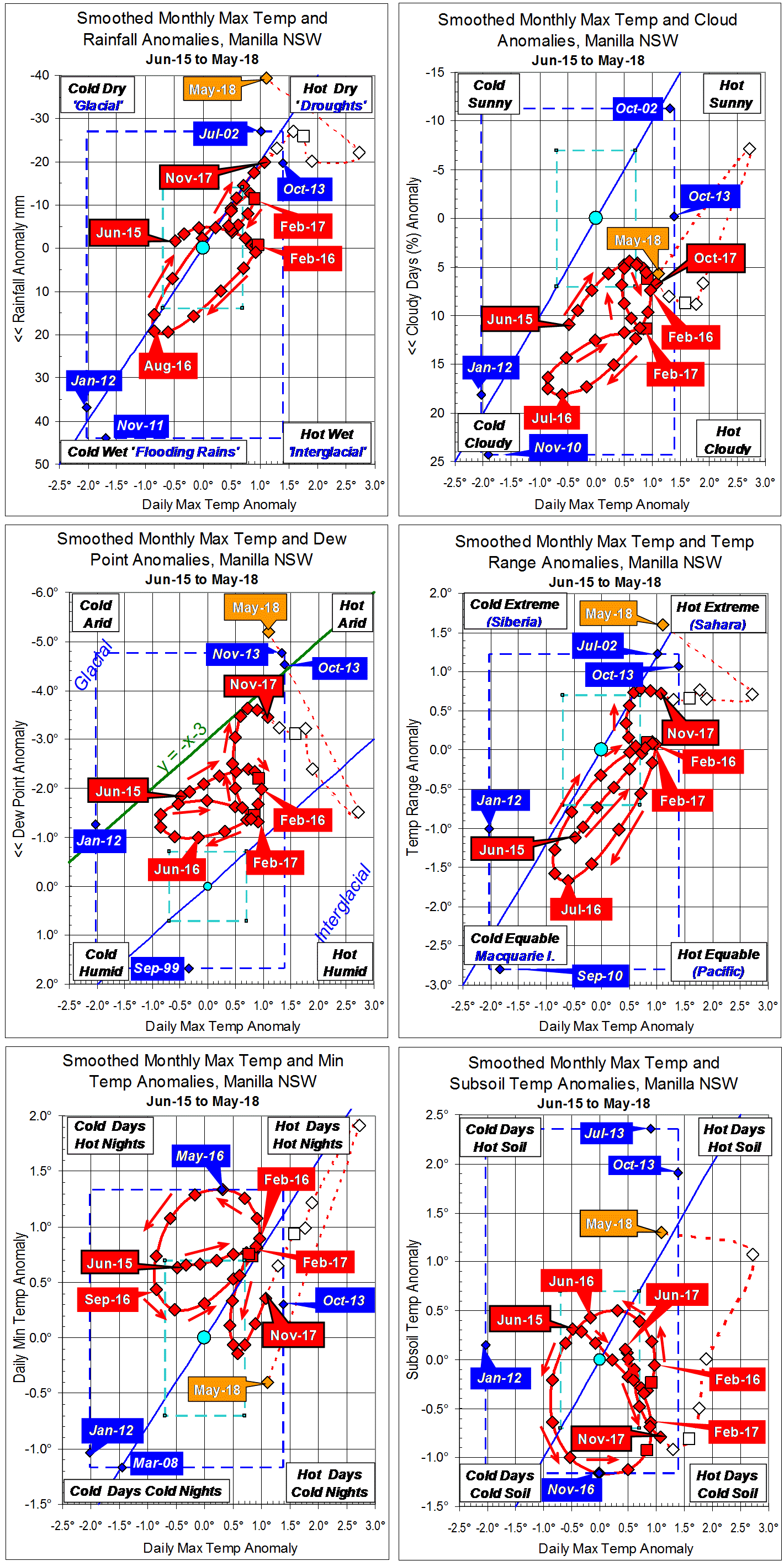 Blue diamonds and the dashed blue rectangle show the extreme values in the fully smoothed data record since September 1999.