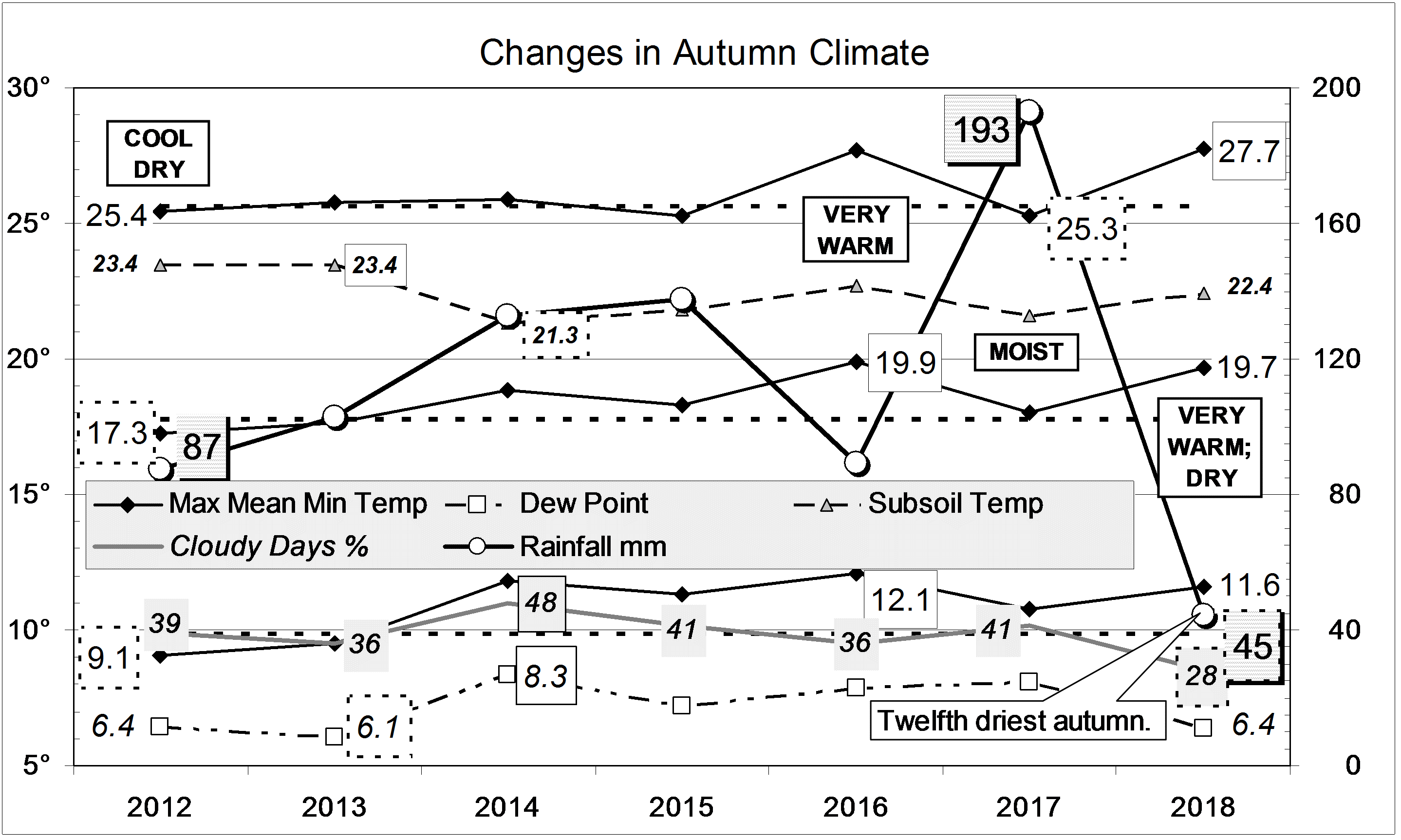 Published June 5, 2018 at 2877 × 1725 in Autumn 2018 dry and very warm « Previous Graphical log of the last seven autumn seasons (MAM) at Manilla, NSW, showing mean values of maximum, minimum and mean temperature, soil temperature, early morning dew point and cloudy days percent, and total seasonal rainfall in millimetres.