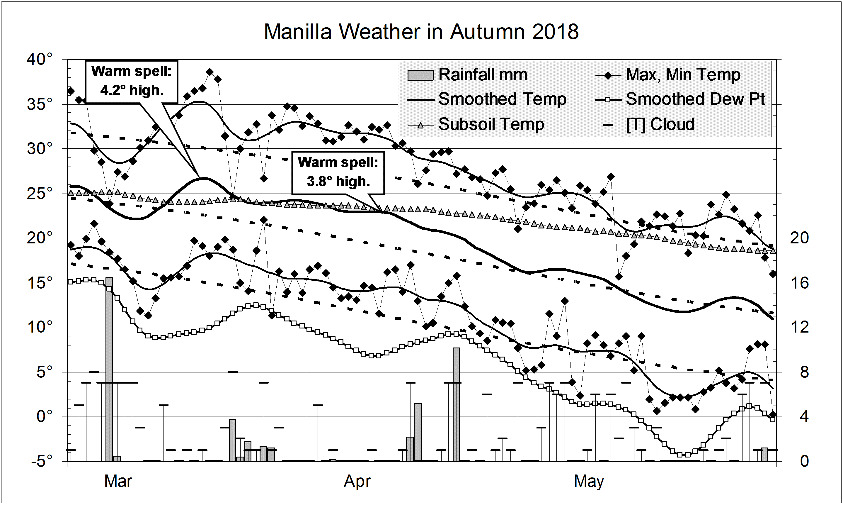 Graphical log, for autumn (MAM) 2018 of daily values of maximum, minimum and mean temperatures, subsoil (750mm) temperature (all in degrees Celsius), rainfall (mm) and cloud amount (octas). Smoothed values of temperature and early morning dew point use a Gaussian smoothing function with half-width 6 days.